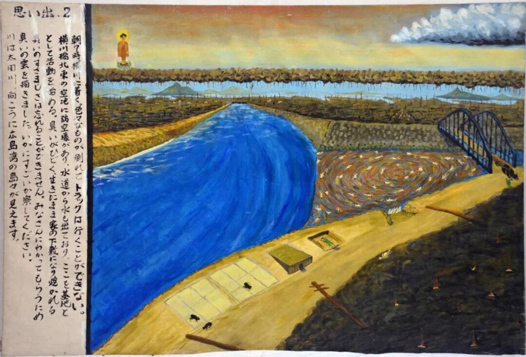 當時我家有六個人,經營小吳服店的父親、母親とし子、我(當時三歲)、剛來到世上的妹妹和祖父母,住在玖波(現在的大竹市)。父親在私人經營之外,應該還在機關裏幫忙。我幾乎沒有被爆時的記憶,只是通過父親留下的親歷紀錄「被爆者の叫び 大竹市原爆被爆者協議会」和不時跟我說起的親身經歷來了解。特別是沒有他因為原爆症而煩惱的記憶。父親從二十多年前起因為興趣開始畫油畫,去世前五六年還在畫風景畫。我不曾一睹父親的工作室,過了三十歲我上小學的兒子跟我說過「爺爺的房間有可怕的畫」,我想就是這次寄贈的這幅畫。我的父親從近二十年前起就一直畫這幅畫,最後沒能完成。