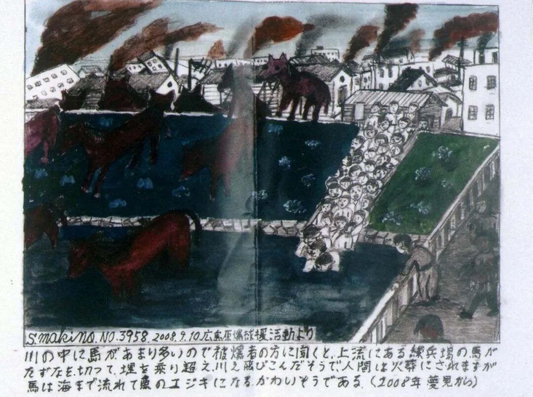 河裏漂浮著太多馬匹,我向一位被爆者詢問後得知,原來是上游練兵場裏的馬弄斷了繮繩,翻越堤防跳入河中。人類會被火化,但馬卻順河著漂流到海裏,成了魚的食物。真是可憐。