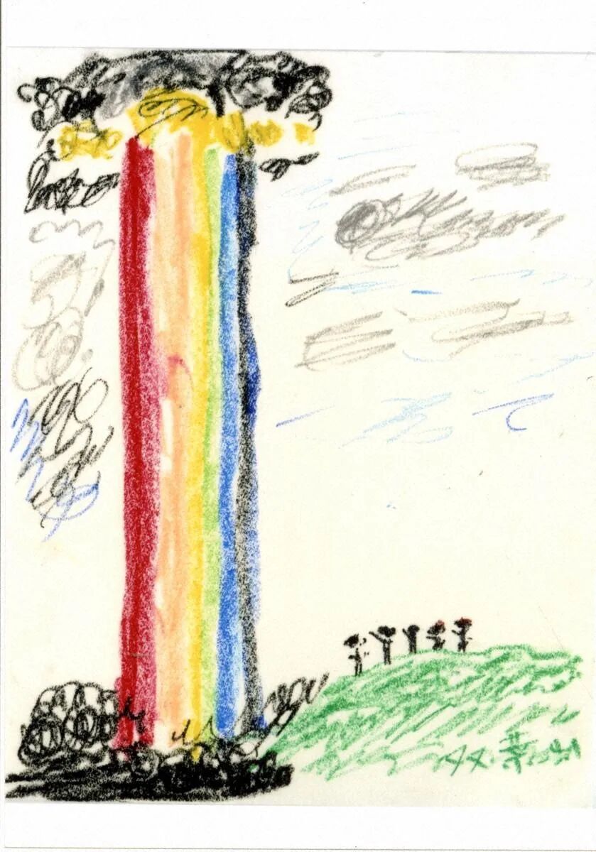 她說,七色的光匯成一束筆直地發光、閃耀地昇上天空。她看到後心想「哇,好美。」但是後來她知道了在這道光下有許多市民因核爆喪命,想到「哇,好美」這樣的話是不敬的,就無法跟人說出這樣的話來。