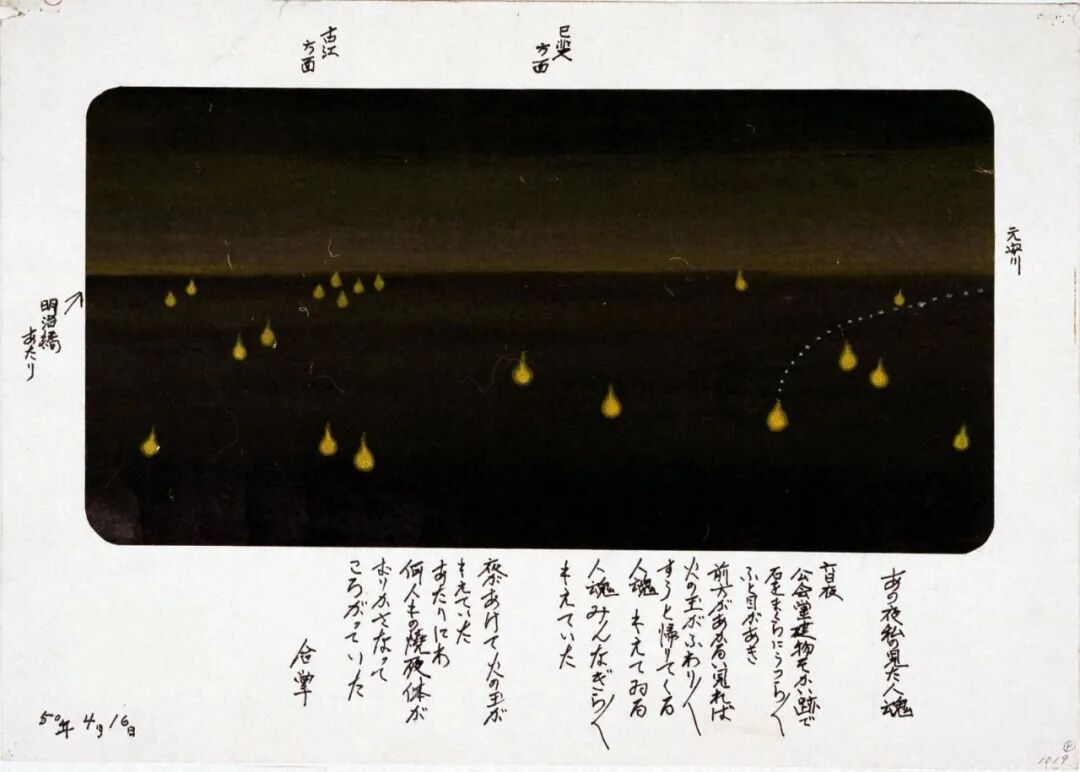 六日夜/我枕著公會堂建築物疏散後的遺跡昏昏欲睡/忽然睜開了眼看到前方明亮 火球飄飄然地浮起 又緩緩落回/人魂在燃燒/所有的人魂都閃閃燃燒著/天亮時火球仍燃燒著/周圍有許多燒死者的屍體疊在一起倒著/合掌