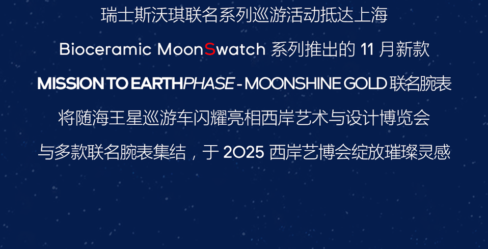 摘要:2025.11.12-16📍上海市龙腾大道2555号,11月MOONSHINE GOLD联名腕表将随海王星巡游车闪耀亮相,呈现时间、创意与艺术的奇妙共鸣!