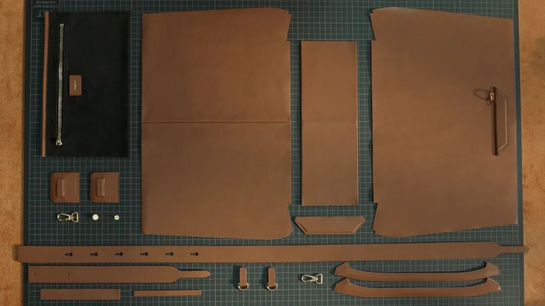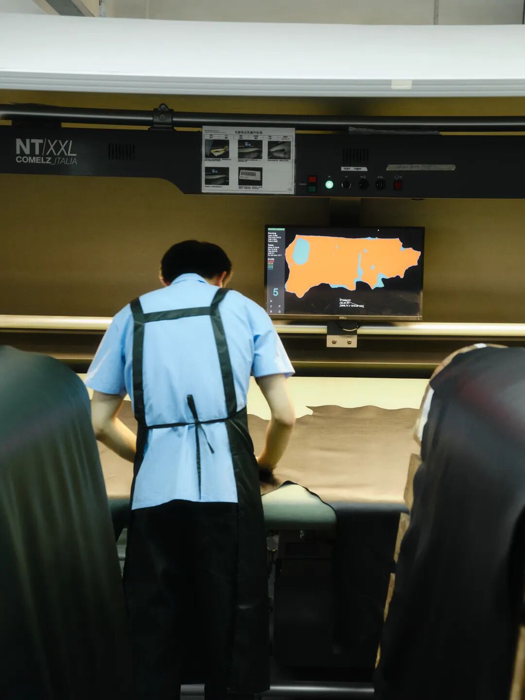 在造物的维度上,数字化也让 DISSONA 更加专业地筛选和使用皮料。一张完整的牛皮,不同位置的特性不同,有的部分拉力更大,有的部分不易回弹。想做好包,就要把最适合的皮用在相应的位置,比如用来承重的部分,就要求皮料回弹后不起褶皱。数字化系统会将整张皮进行扫描,识别纹理的方向,分类划出制包的皮面区域,再圈出不能用的瑕疵。每一张皮都会进行划分排版,生成条码,入库后按照品质最优的方式进行裁剪、制包。
