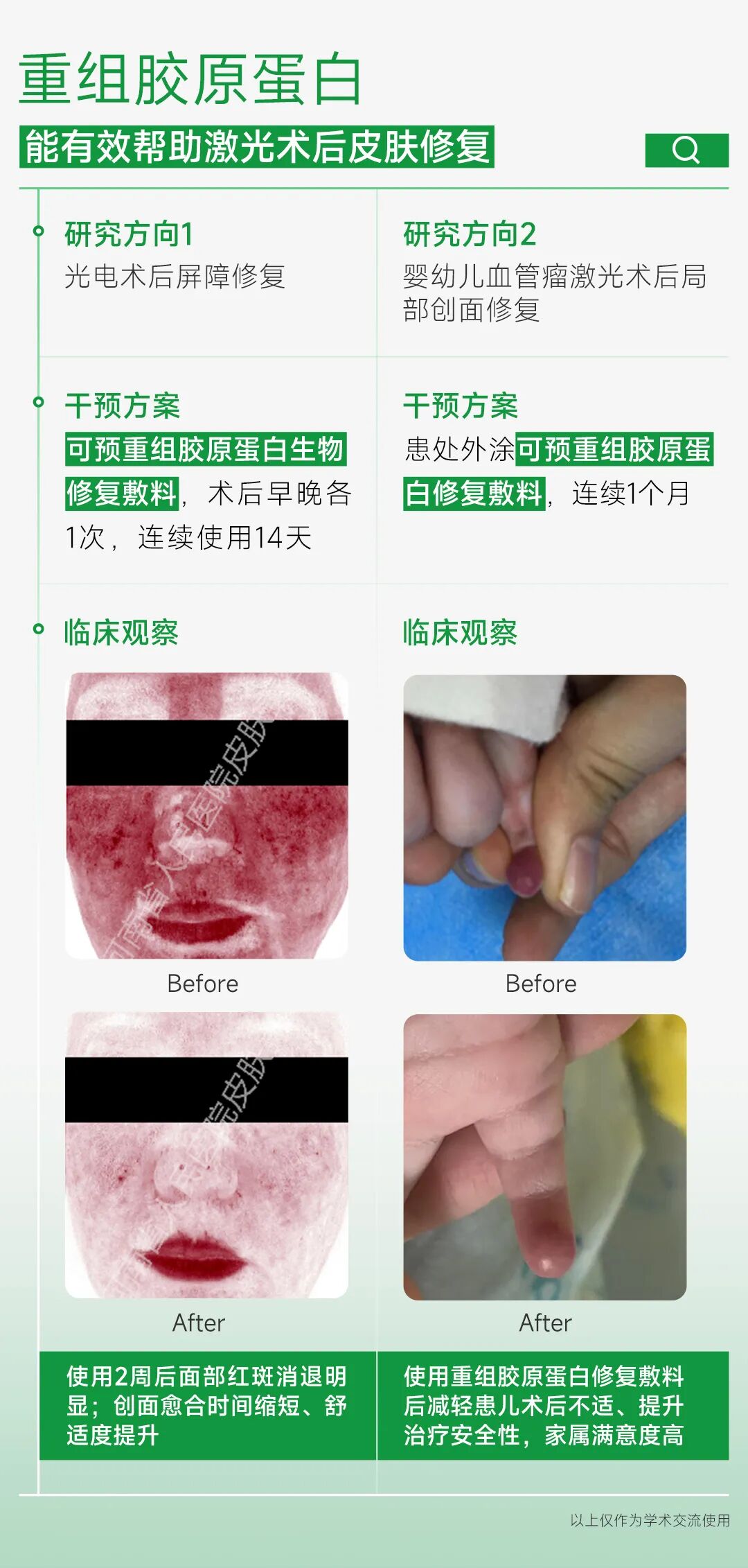 激光术后局部创面恢复主要以修复屏障、减轻色沉、缩短恢复期、减轻患者疼痛及不适感为主要目标。皮肤科专家李雪莉教授与朱珠教授分别围绕光电术后、婴幼儿血管瘤激光术后展开了相关临床试验研究,研究结论进一步验证了重组胶原蛋白在此类临床应用中的有效性及安全性。