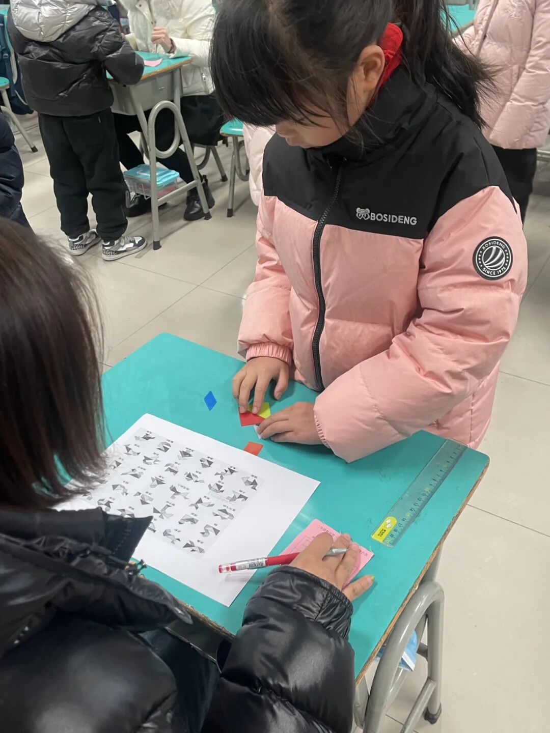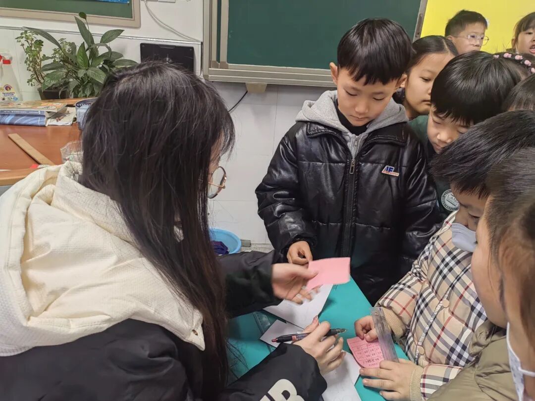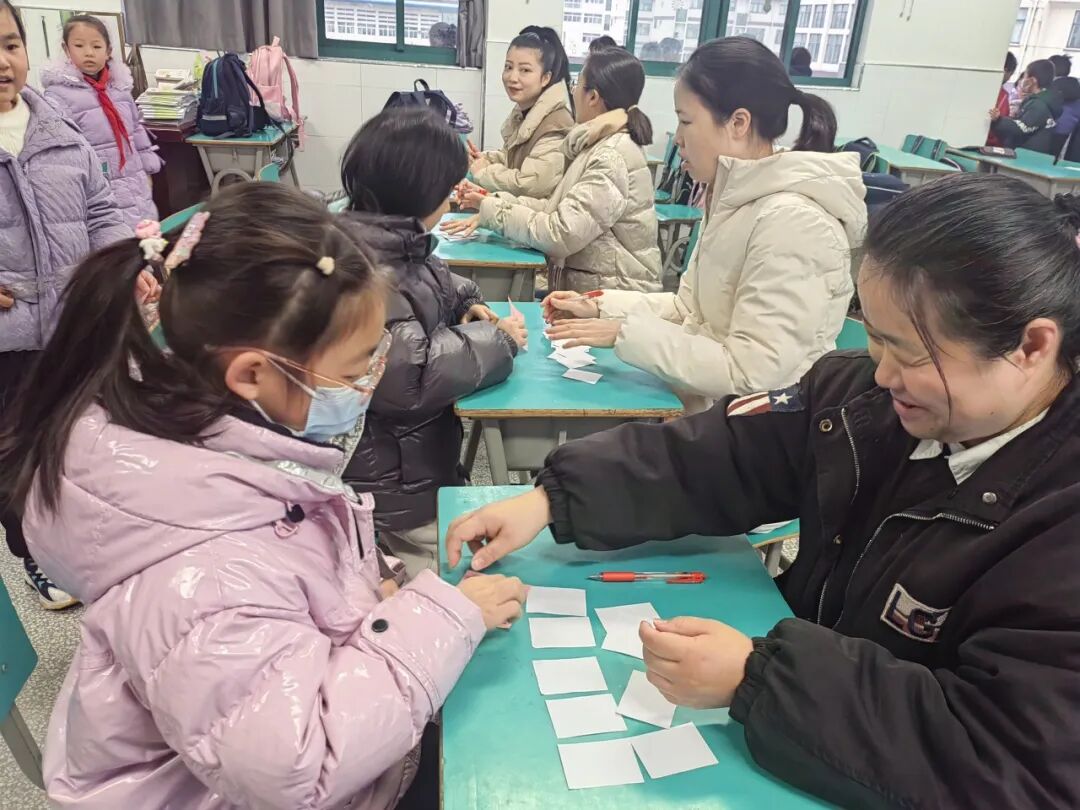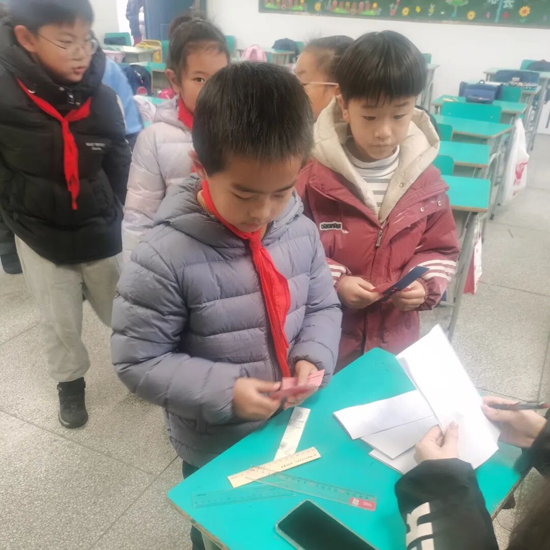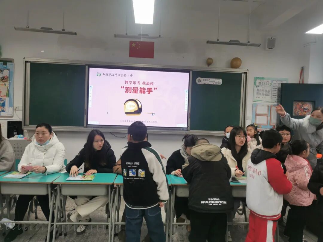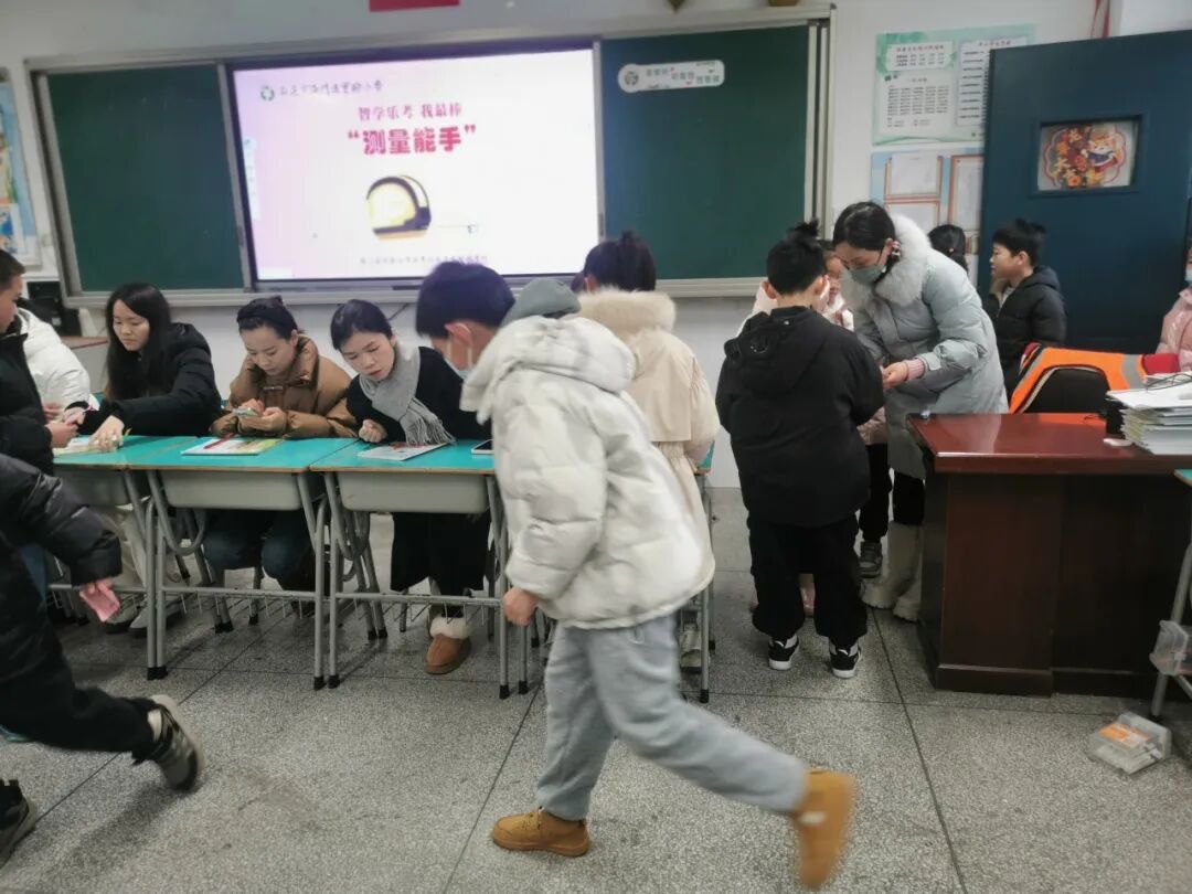 孩子们根据抽到的题卡上的题目,变身“测量能手”,或用直尺,或用“身体尺”,测量出身边常见物体的长度,在动手实践中掌握测量本领,感受数学与生活的密切联系。