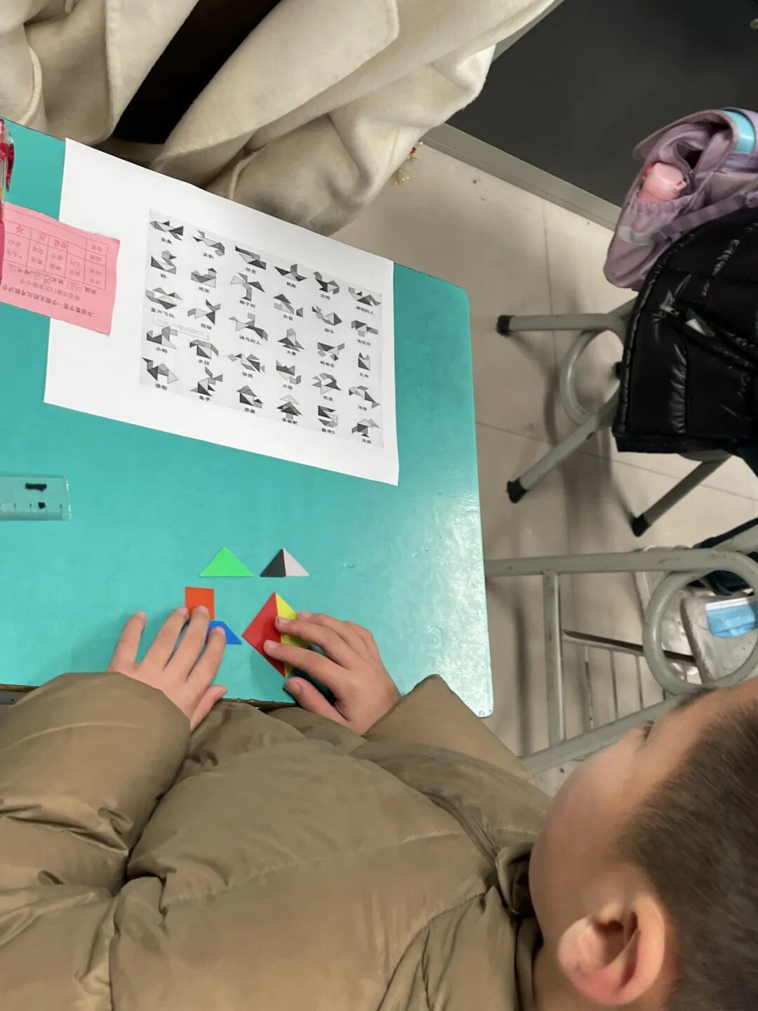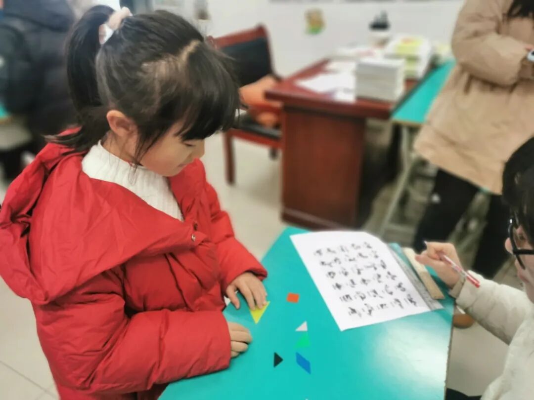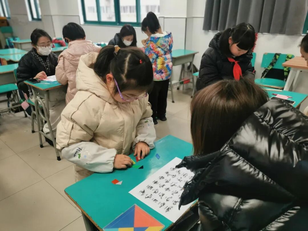 “我拼出了6个”一个孩子高兴地喊着,这是“欢乐七巧”的考核现场。孩子们用老师准备好的七巧板,在1分钟内拼出了小鸡、城堡、汽车……一个又一个的奇妙图形。考核时,孩子们全力以赴,认真思考,快速操作,在活动中体验着成功的乐趣。