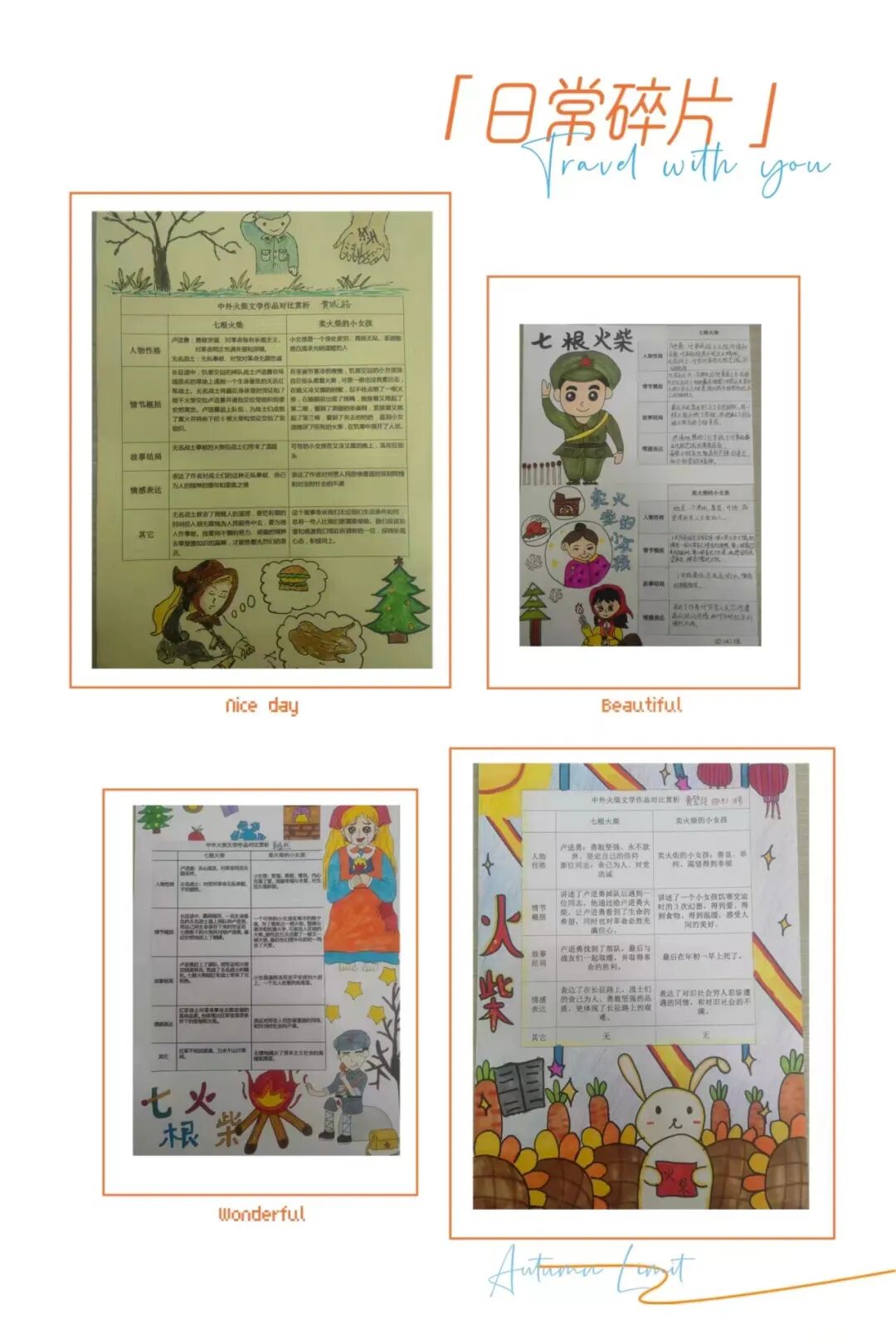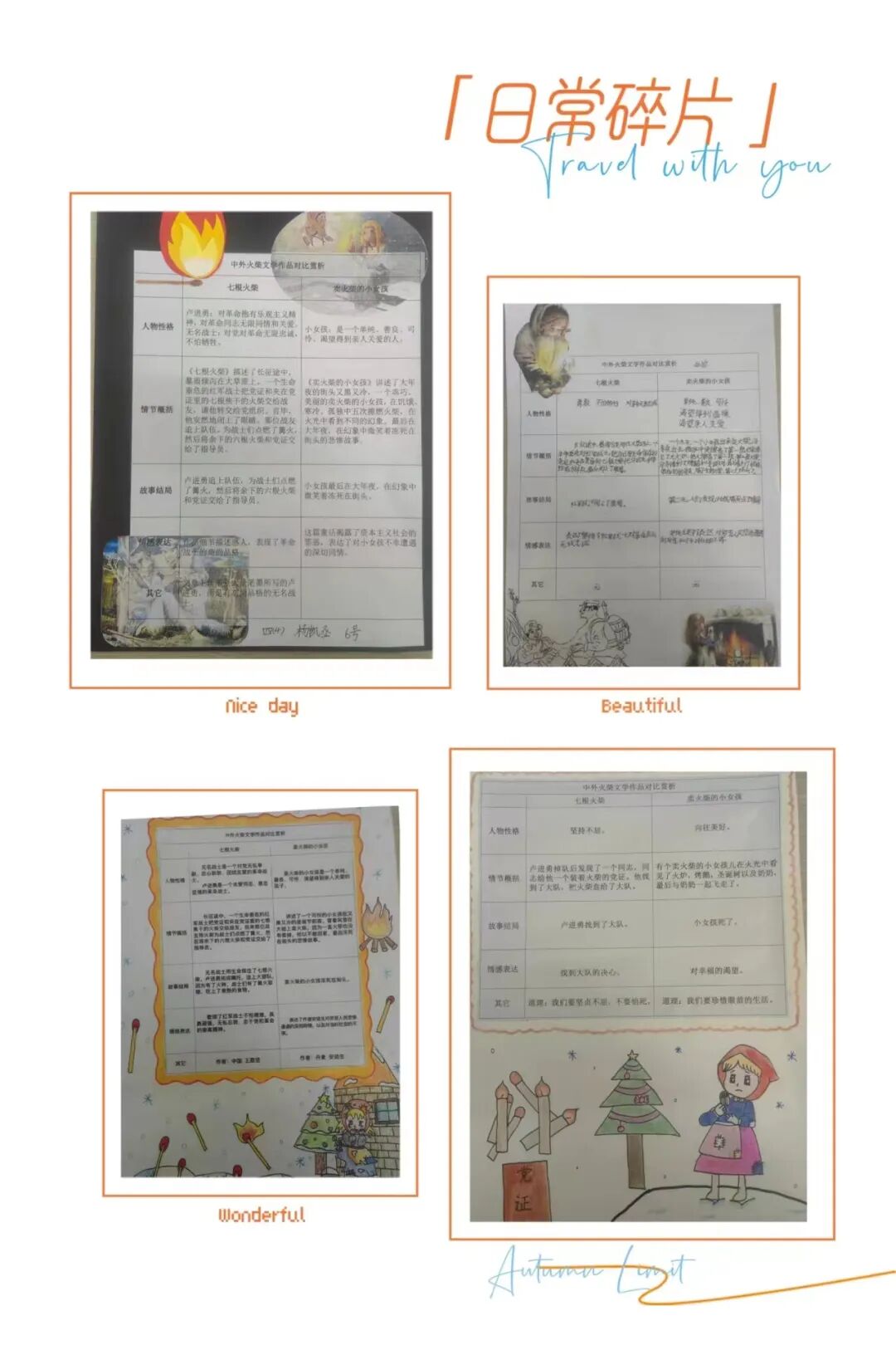 在世界文学宝库里,关于火柴,有许多经典作品,这些名篇名著深受各国人民的喜爱,成为人类共同的精神财富。孩子们对《七根火柴》和《卖火柴的小女孩》这两篇中外经典故事进行了对比学习。通过对比赏析,我们可以更深入地理解它们的内涵和价值所在。