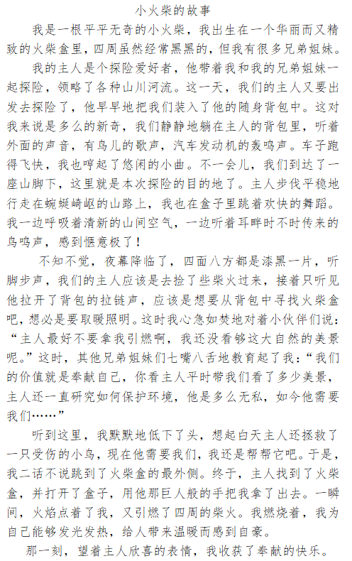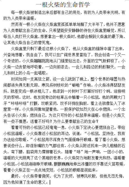 在生活中,我们寻找到了身边一些火柴梗般,为人类奉献一生的人物。他们在自己的工作岗位上,立足本职,无私奉献,诠释了做一根小小火柴梗的真谛!