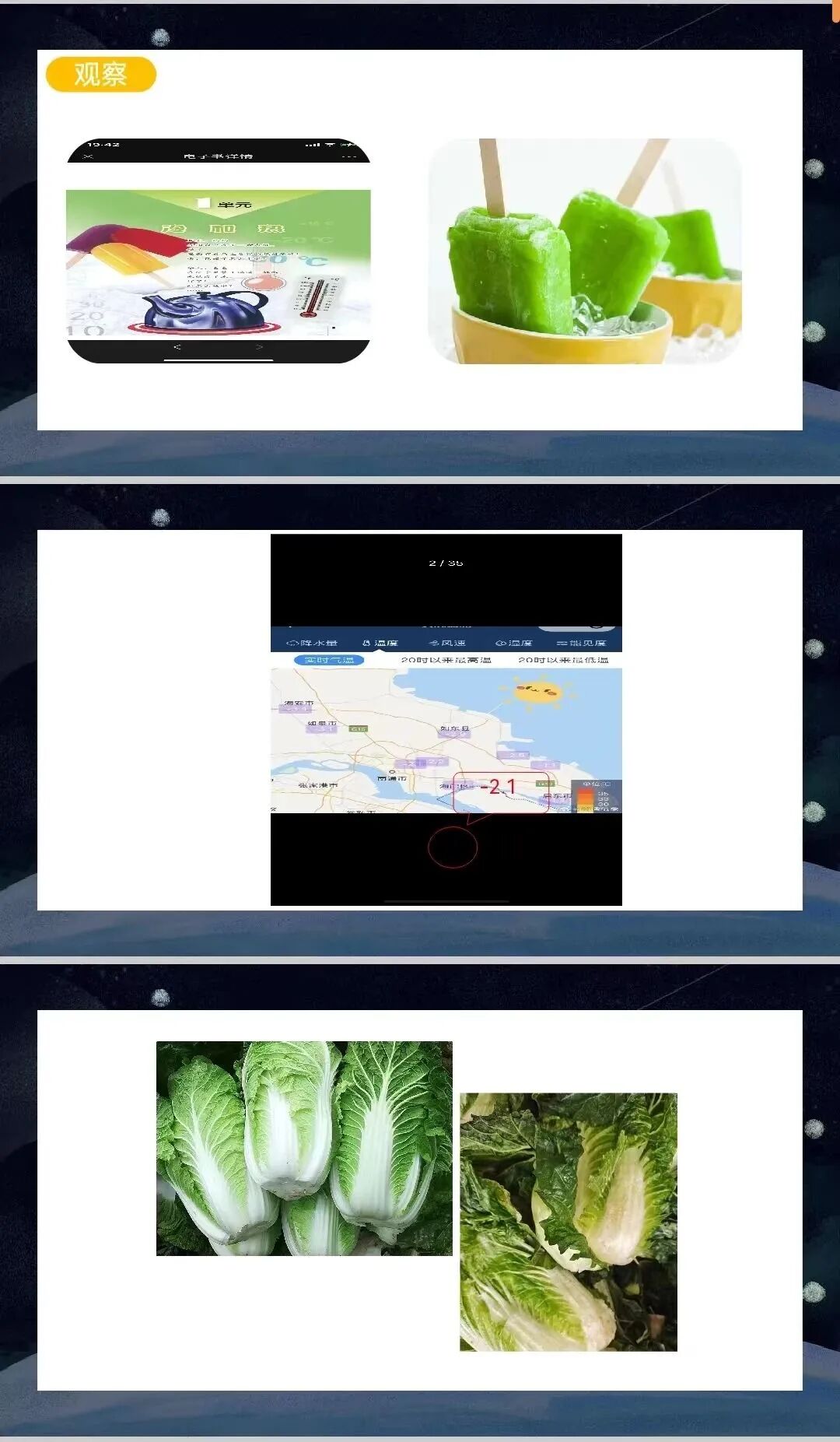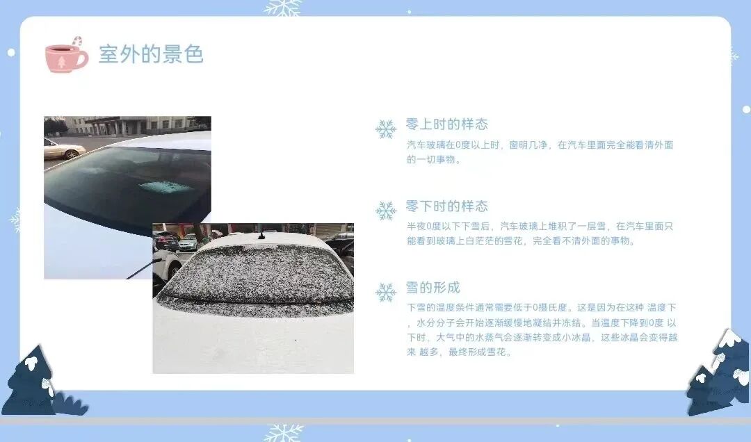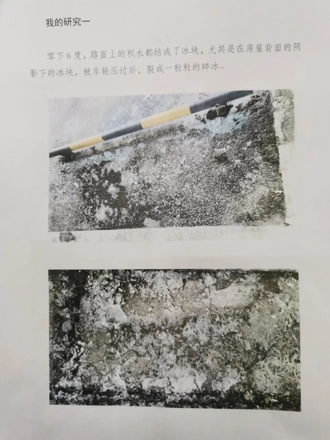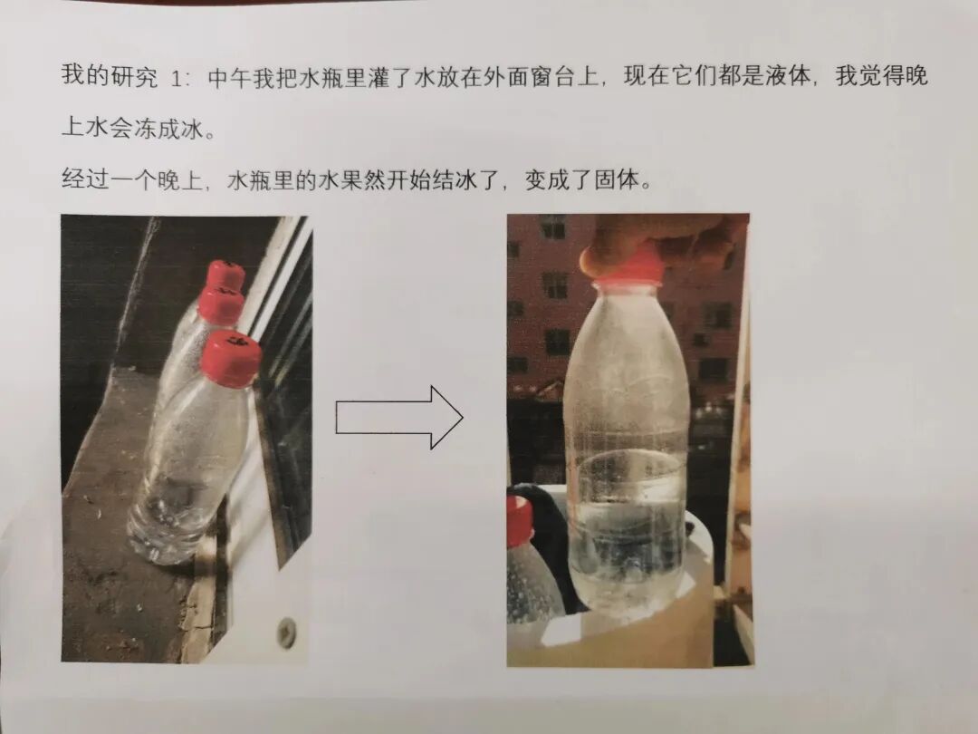 泥土、蔬菜、水缸、窗玻璃、汽车、院子里的石雕……生活中的事物都成了孩子们研究的对象,观察他们在零上和零下时的不同样态,感受温度对于事物造成的影响。