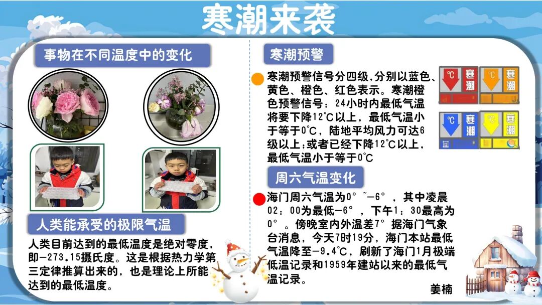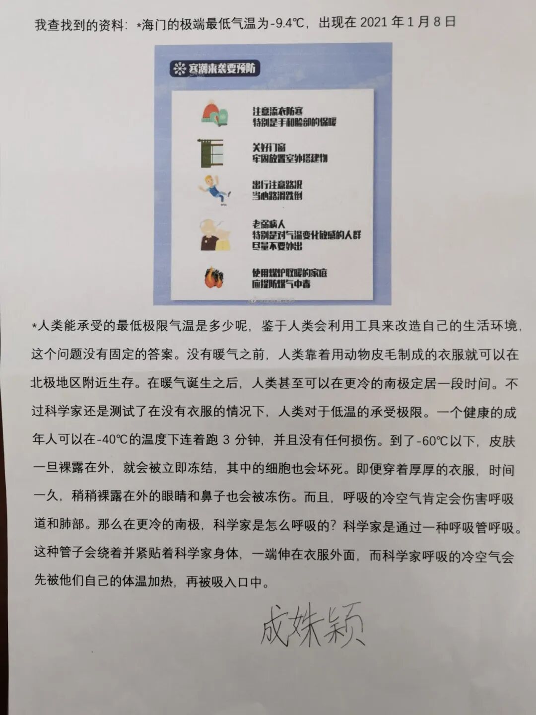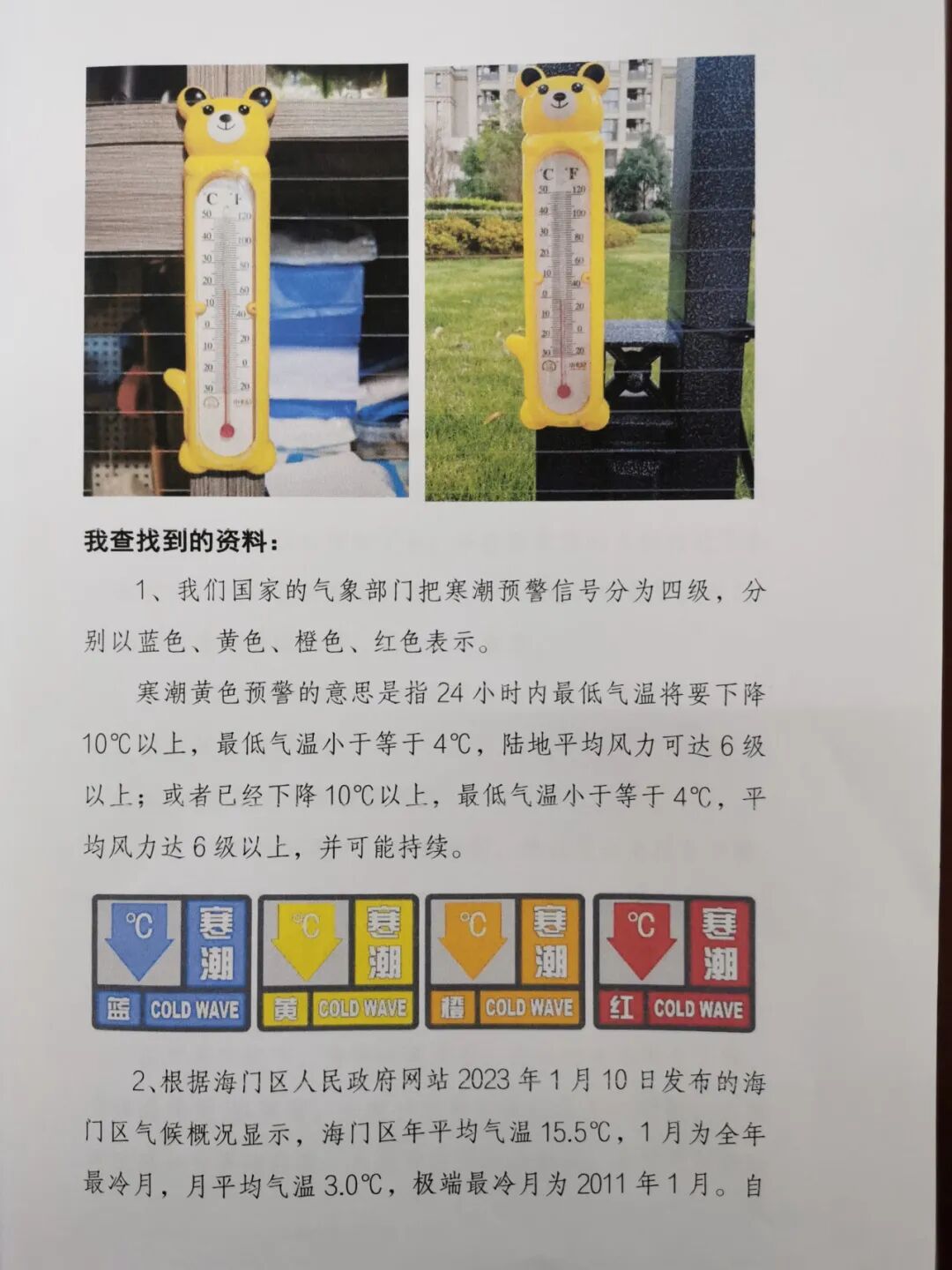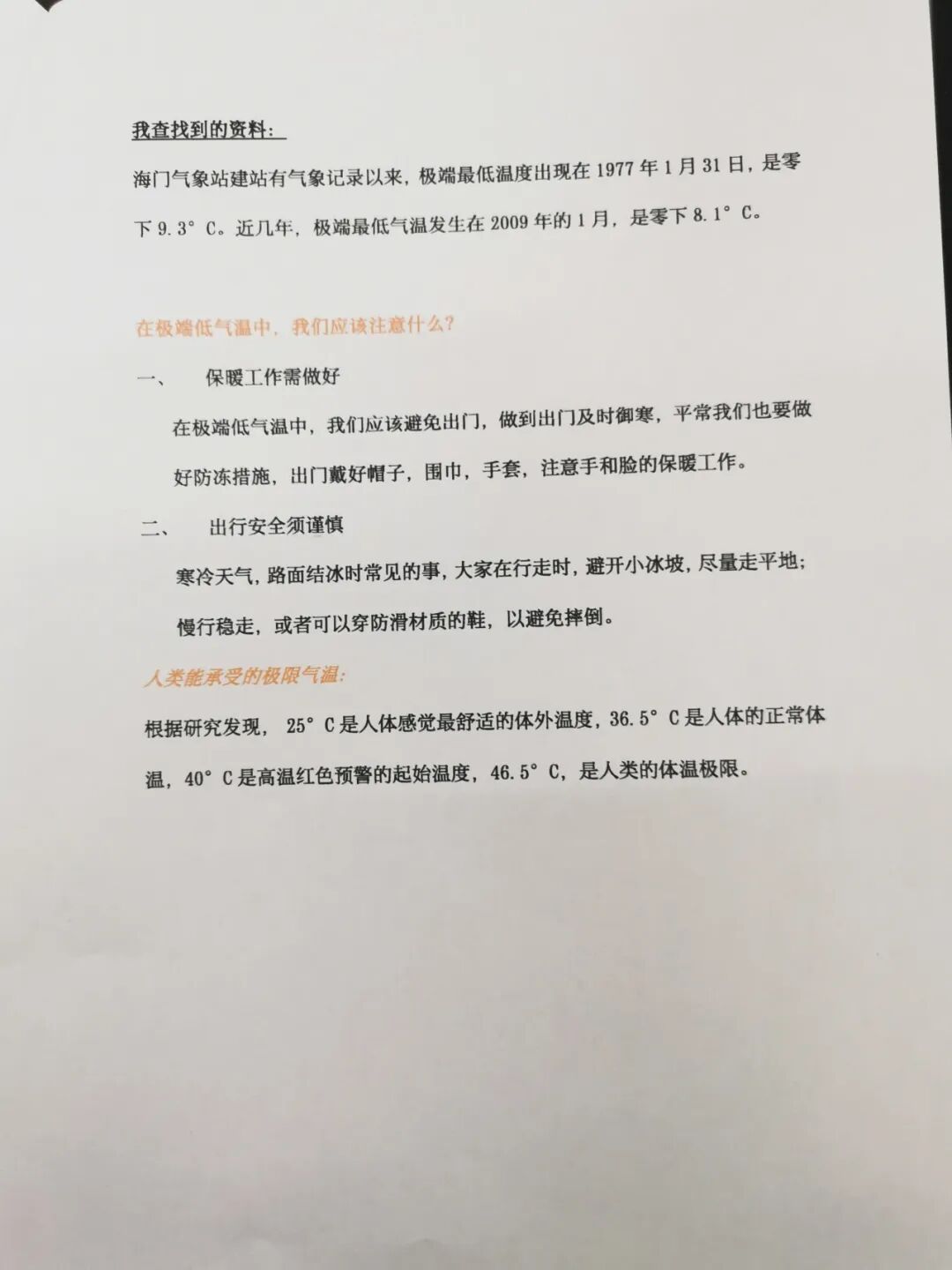 寒潮橙色预警又是怎么回事?海门历史上极端最低气温是多少度?是在哪一年?在极端低气温中,我们应该注意些什么?人类能承受的极限气温是多少?我国最冷的地方是在哪里?孩子们查阅资料,原来温度的学问还不少呢!