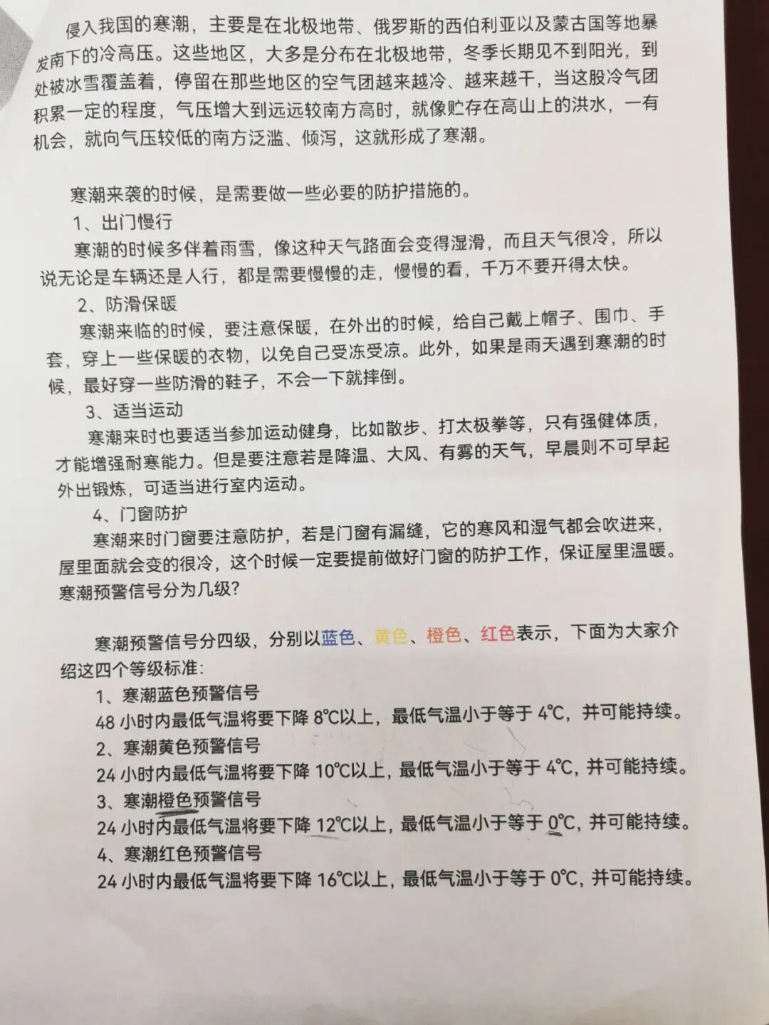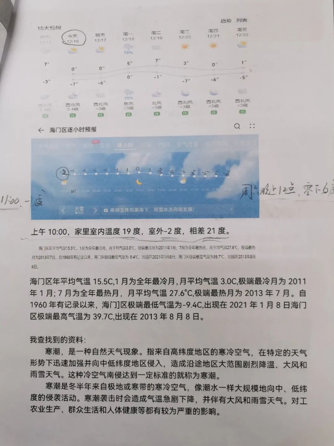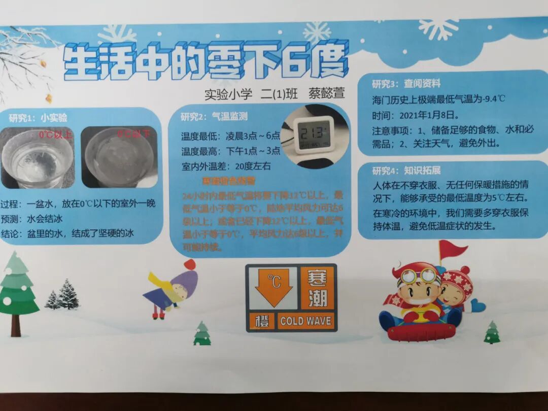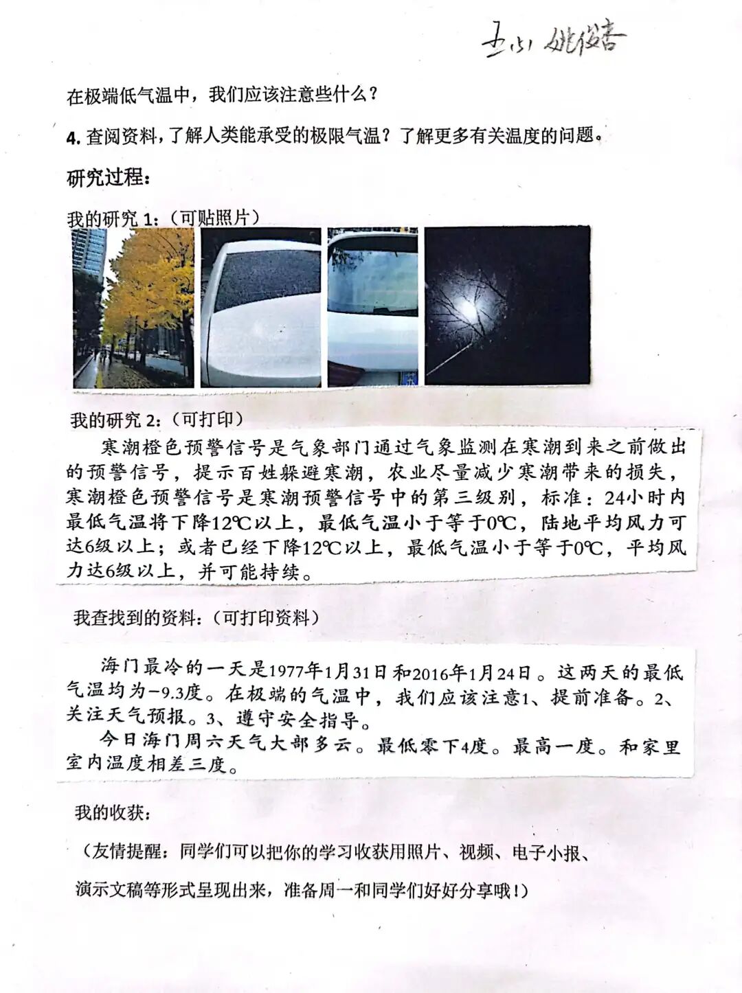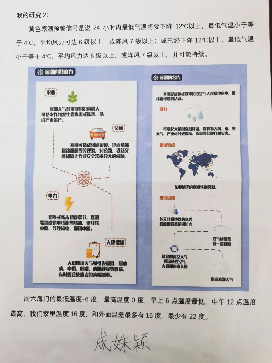 寒潮橙色预警又是怎么回事?海门历史上极端最低气温是多少度?是在哪一年?在极端低气温中,我们应该注意些什么?人类能承受的极限气温是多少?我国最冷的地方是在哪里?孩子们查阅资料,原来温度的学问还不少呢!