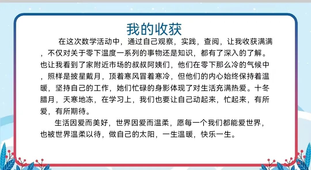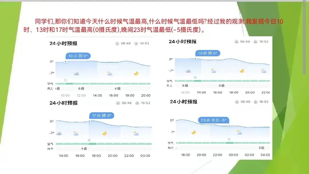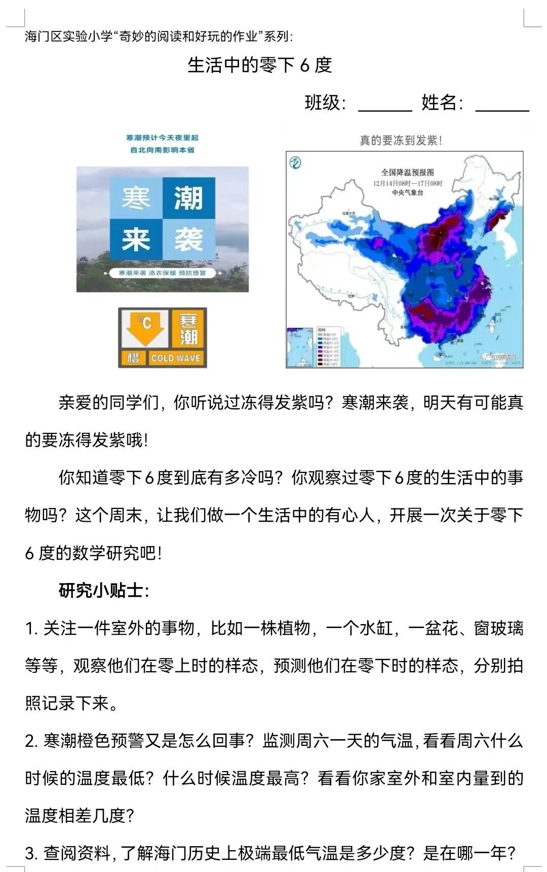 数学大阅读就是要走进生活,感受生活与数学的联系。断崖式的降温、寒潮橙色预警、零下6度,都是真真实实存在的,老师们抓住鲜活的生活素材,设计了“生活中的零下6度”主题学习活动,带领孩子们一起研究、实践、调查、分享。
