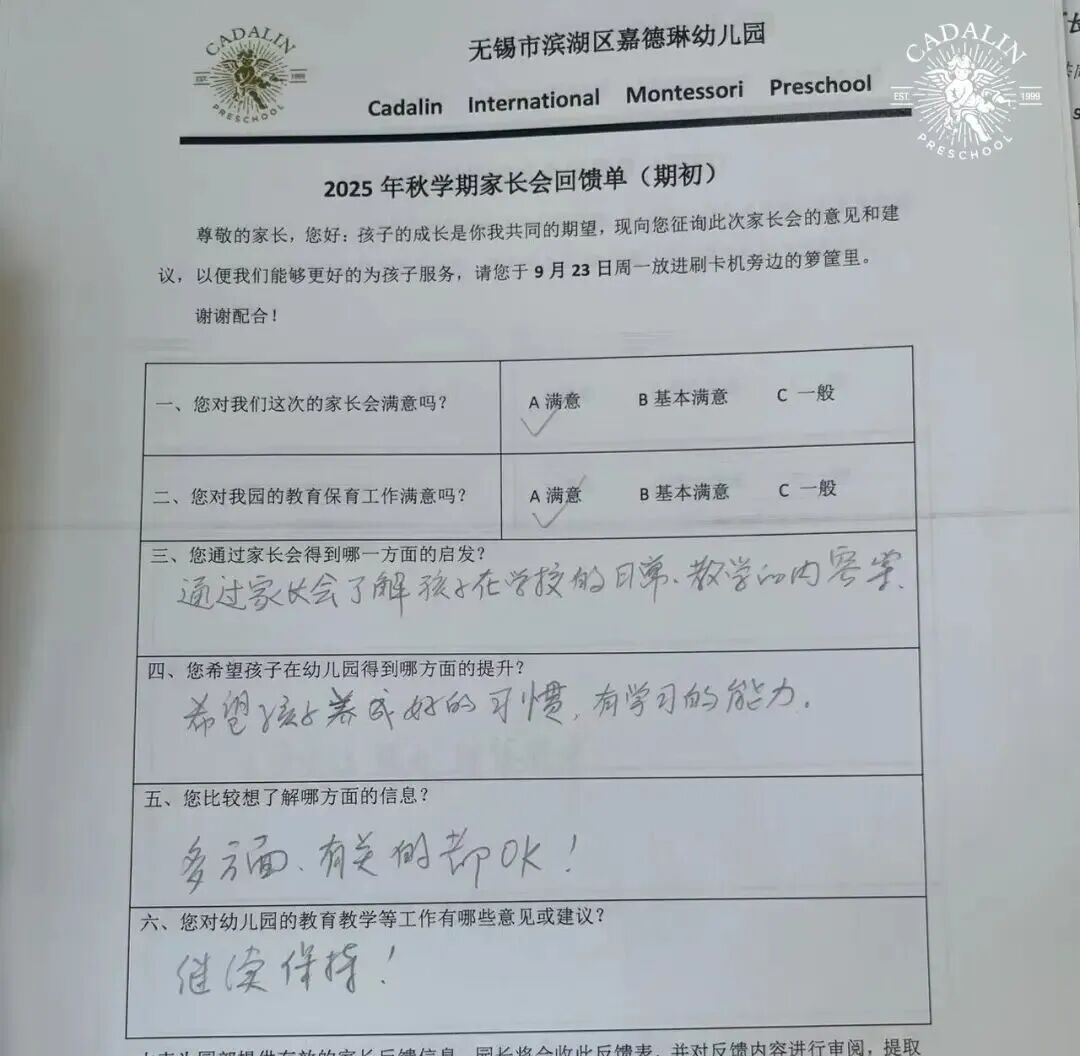 会议尾声,发放了精心准备的 “家长反馈表”,家长们也用心的写着反馈和建议等实用的内容。在老师与家长的交流中,感受到了此次家长会让他们对蒙氏教育有了全新的认识,也找到了与孩子共同成长的方向。