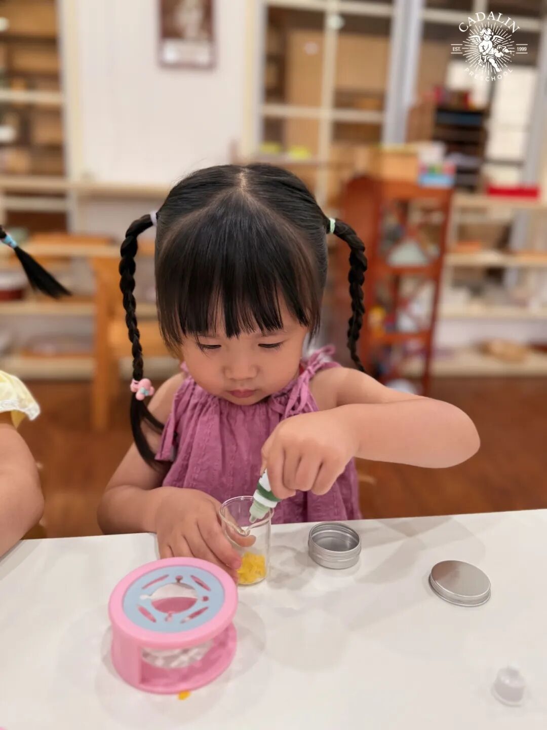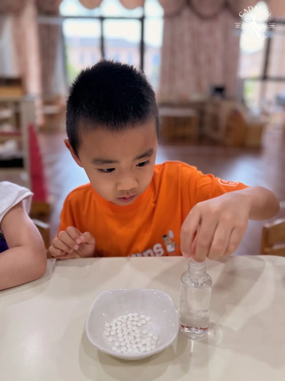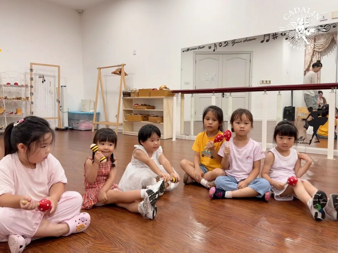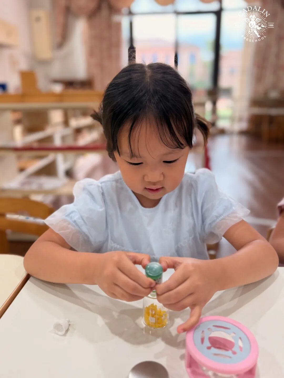 通过敲击不同水位的玻璃瓶,感受高低音,满瓶“咚”沉,浅瓶“叮”脆。宝贝们握着沙锤,轻摇“沙沙”伴,重晃“簌簌”和,乐在其中,收获满满。