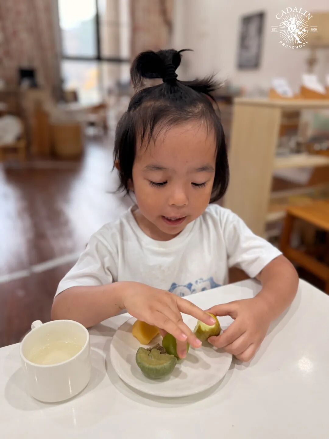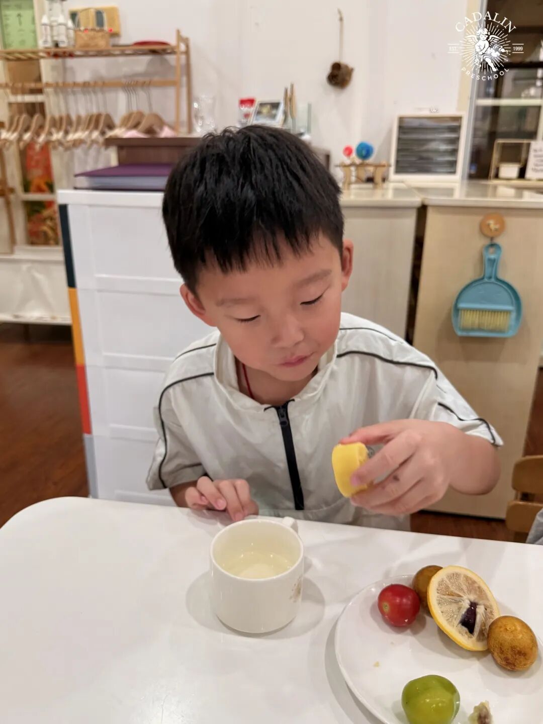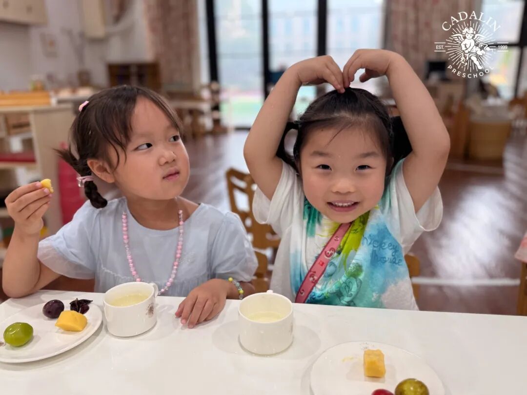 一口柠檬蜂蜜茶,酸甜沁凉驱走暑气。宝贝们自选水果点心,捧杯细啜,一起交流品尝,甜甜的香气与欢笑声在空气里交织。