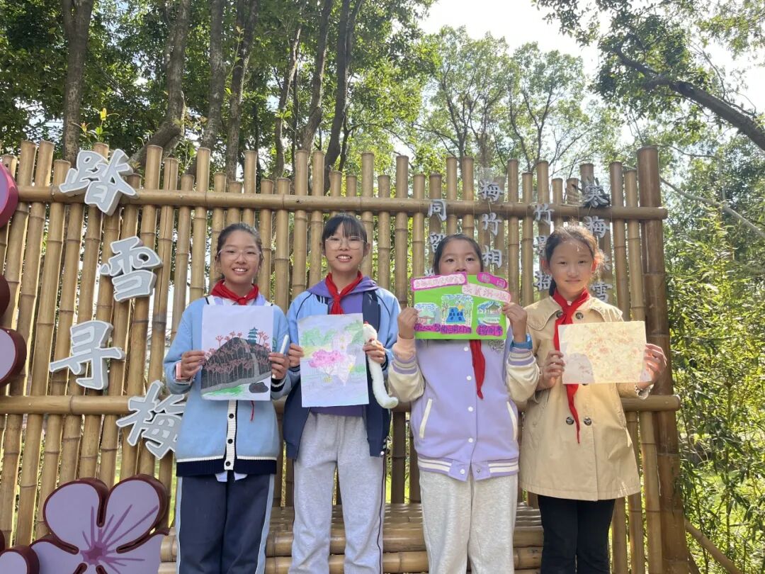 漫步梅园,孩子们与花同游,在花香中体会其“迎风怒放”的品格,激励自我刻苦学习、锤炼意志。