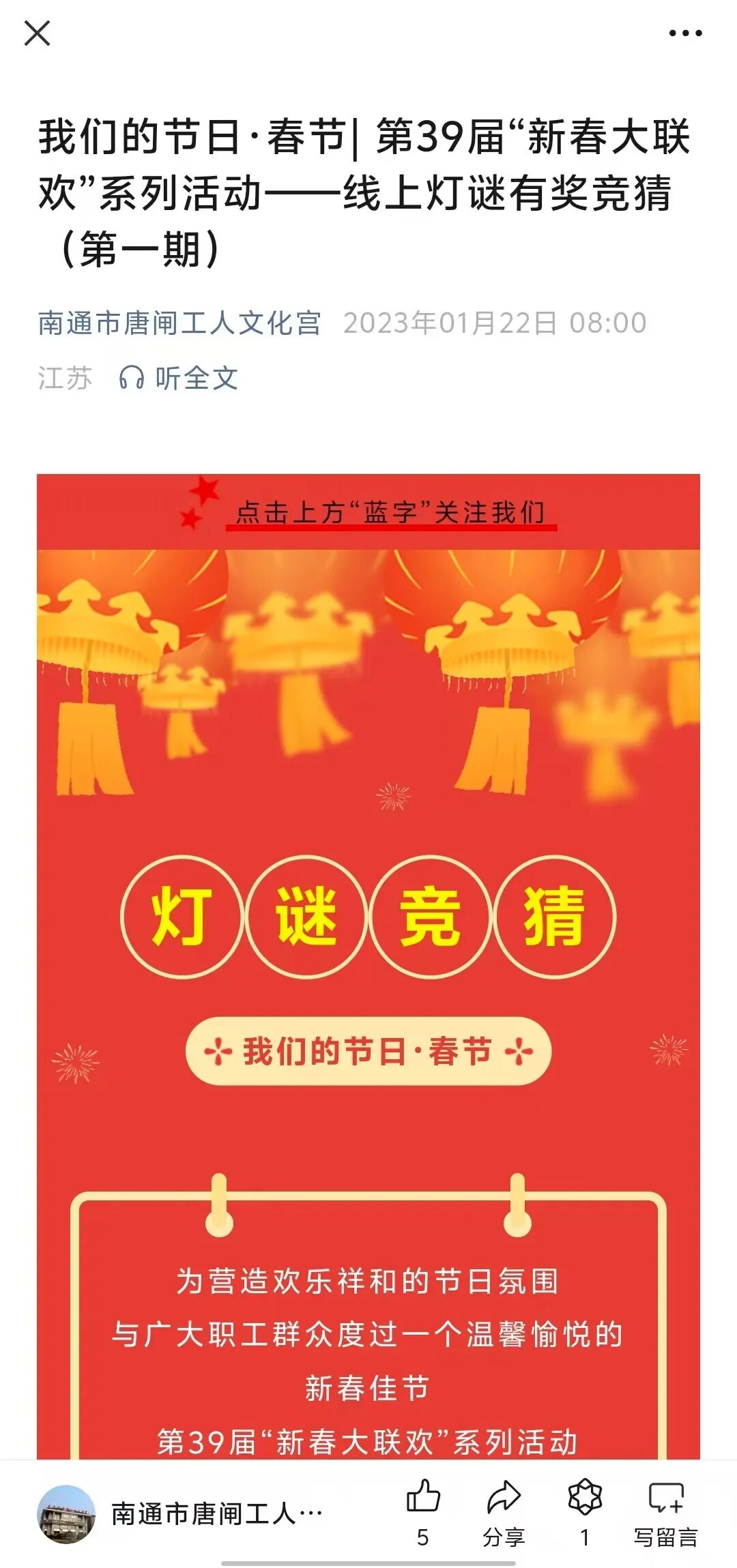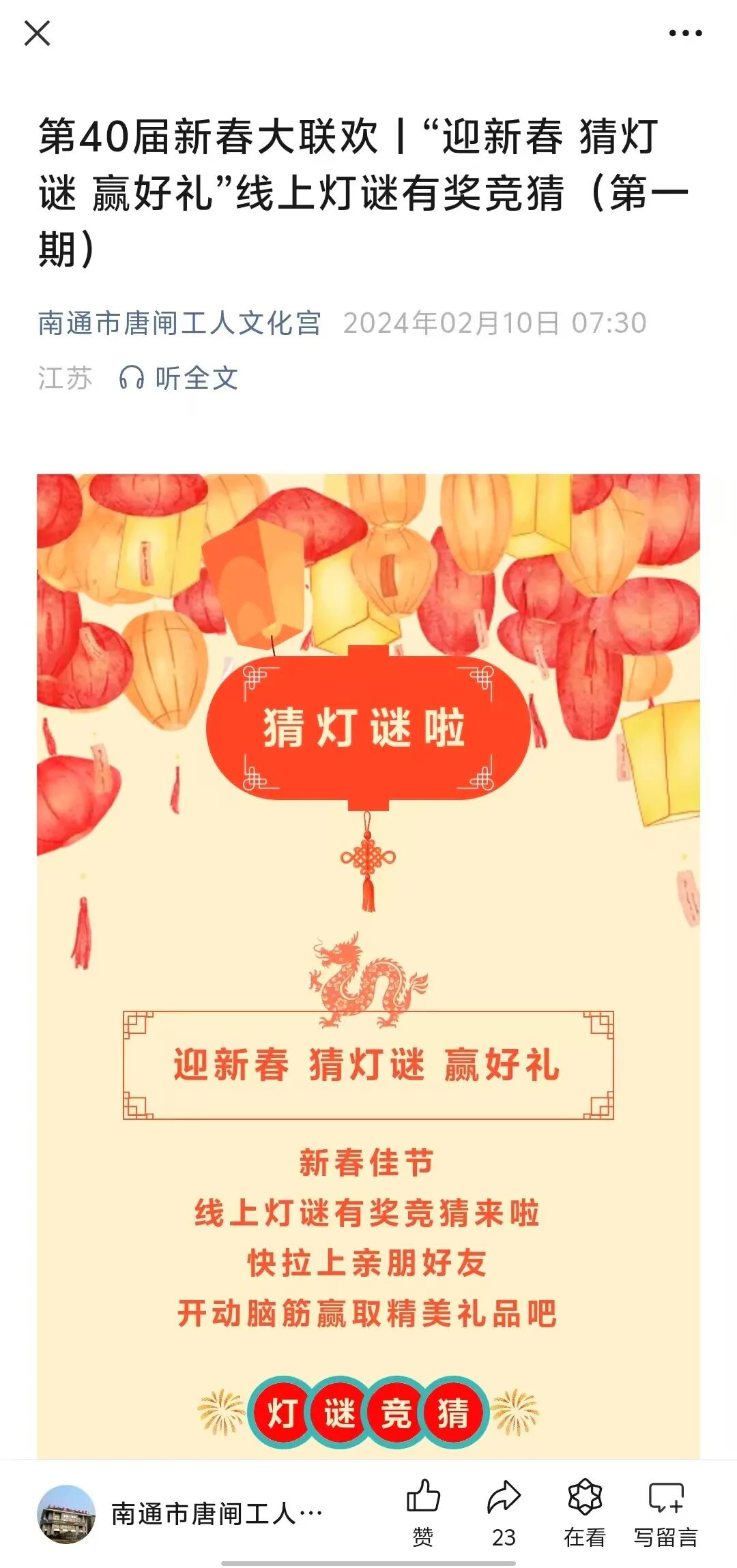活动内容:关注“南通市唐闸工人文化宫”微信公众号,在文章下方回复“日期+序号+谜底”,按新春期间五期、元宵期间四期,答对灯谜总数计算(若总数相同,则按答题时间先后计算)新春期间取前20名、元宵期间取前15名,每人可获得精美奖品一份。
