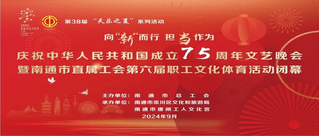 9月30日晚7点,“向‘新’而行 担当作为” 庆祝中华人民共和国成立75周年文艺晚会暨南通市直属工会第六届职工文化体育活动闭幕在南通市唐闸工人文化宫职工大舞台隆重举行。本次活动由南通市总工会主办,南通市崇川区文化和旅游局、南通市唐闸工人文化宫承办。