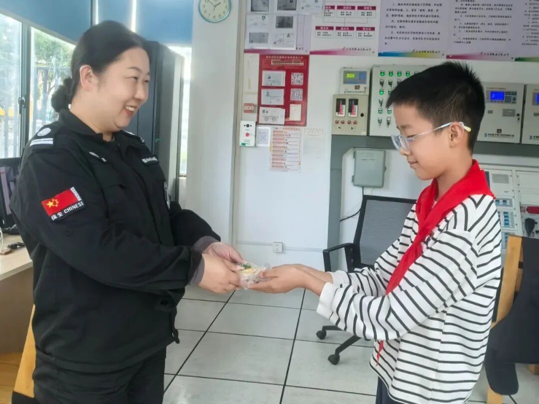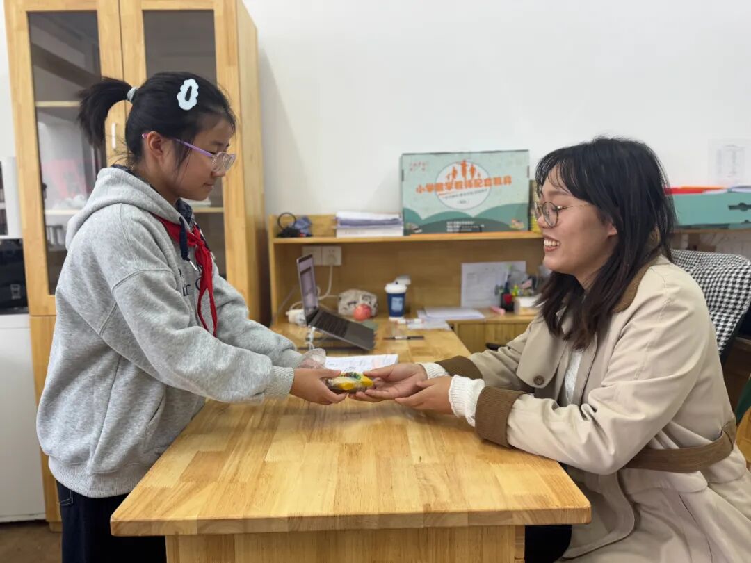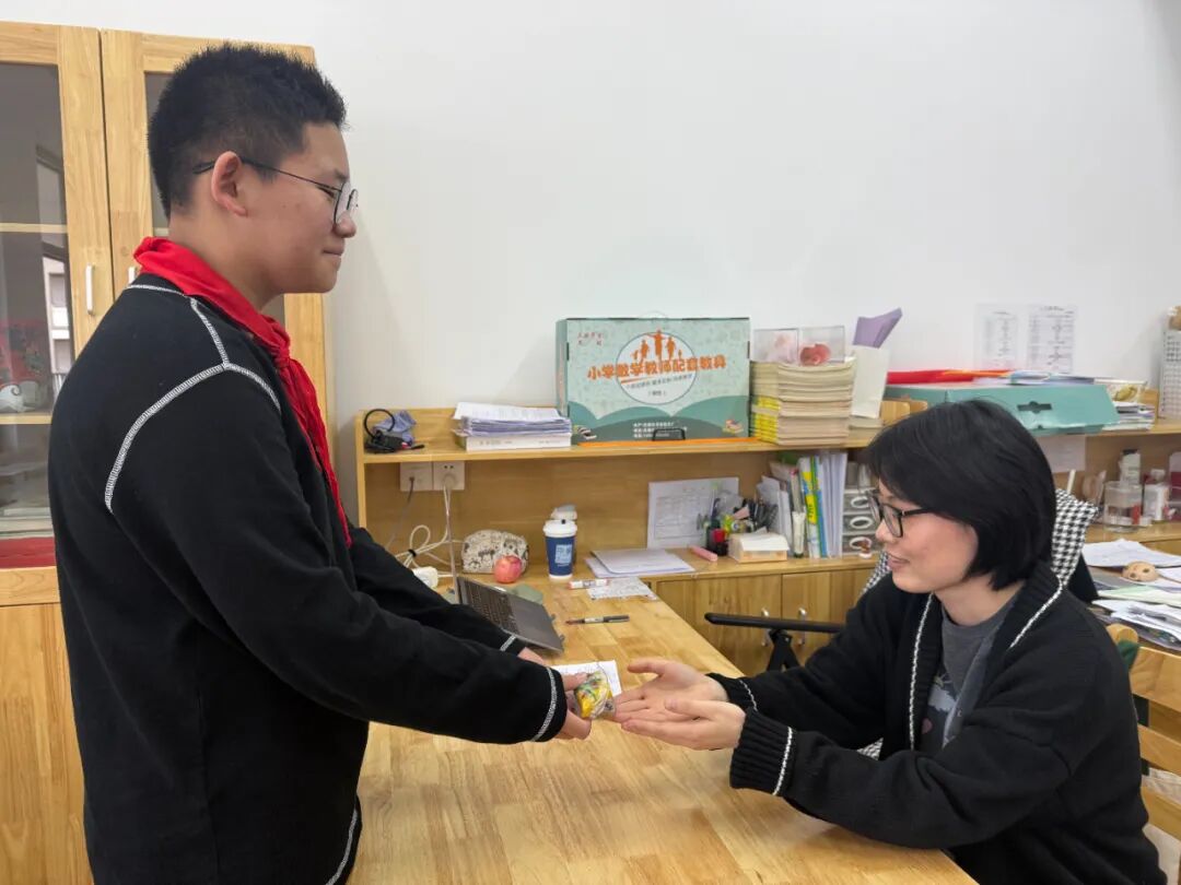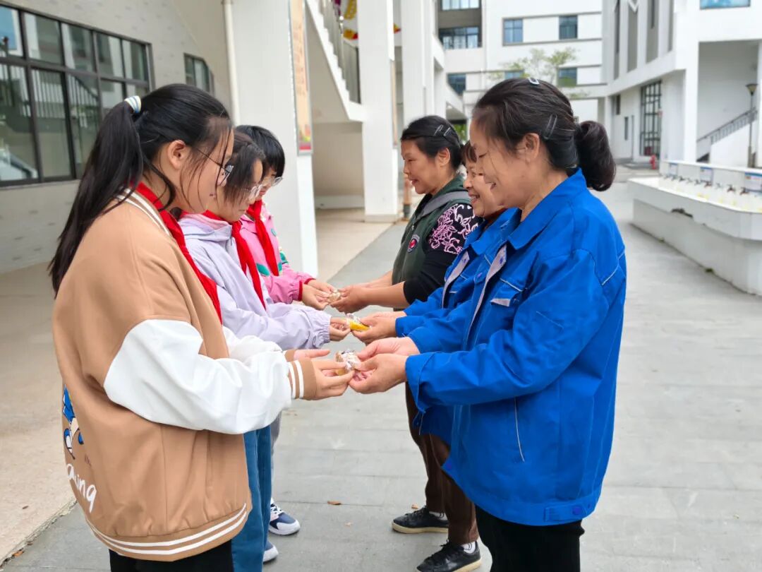 分装完成后,他们将温暖的心意送给了平日里默默守护校园的保安叔叔、保洁阿姨和辛勤教导他们的老师。一声“您辛苦了”,一块软糯的重阳糕,传递着最真挚的感恩。