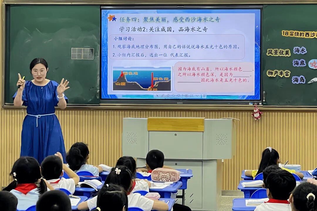 顾莎老师执教的是三年级上册《富饶的西沙群岛》一课。她以一张充满神秘色彩的邀请函创设语文学习情境,邀请学生走进美丽的西沙群岛,亲身体验西沙群岛的风景优美和物产丰富。顾老师紧扣单元语文要素,引导学生借助关键语句理解文本,注重文本前后勾连,激发学生们化身小小探险家,用好奇的眼睛和灵动的思维,探索西沙群岛的秘密。