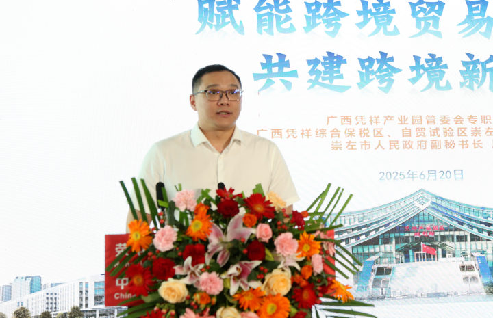 中国-东盟(凭祥)跨境贸易中心董事长彭霏介绍凭祥跨境贸易中心的业务概况,希望通过服务平台,为集团培养优秀电商人才,提供一站式电商服务,有效赋能产业园区的产业发展,助力企业和地区实现跨境电商扩展和直播电商业务高速增长。