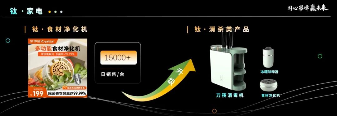 荣电集团对钛金属进行了深度探索与应用,将其抗菌、耐腐蚀、轻量化等卓越特性巧妙融入家电设计之中,构建起了厨房、生活、个护三大钛家电矩阵。