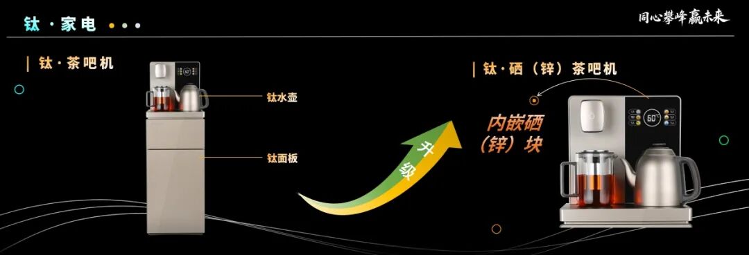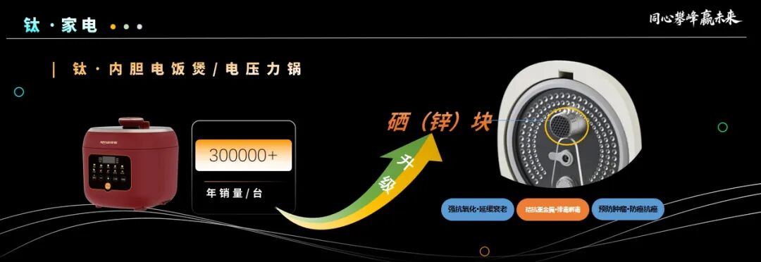 在本次峰会中,荣电集团发布的电饭煲、电压力锅、茶吧机等家电产品,不仅采用了纯钛内胆,还创新性地融入了硒(锌)块,实现了健康功能的全新升级。与此同时,钛食材净化器、钛景泰蓝碳电两用火锅等全新钛产品的惊艳亮相,更是重新定义了高端健康家电的标准,为用户带来了全场景的健康生活体验。