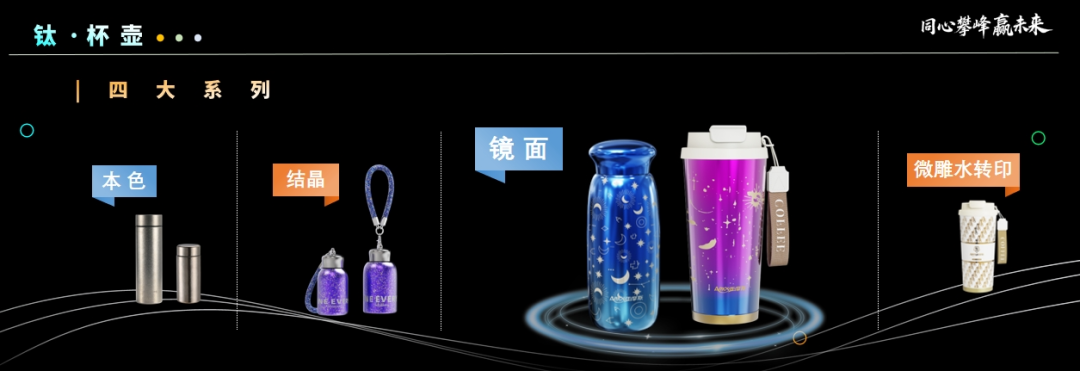 目前,集团杯壶产品主要分为本色、结晶、镜面、微雕水转印四大系列,同时还能利用阳极氧化工艺,将多种风格图案精准刻复于钛板之上,充分满足了用户和政企的定制需求。无论是日常出行还是商务办公,荣电集团的钛杯壶都能为用户带来便捷、健康、时尚的饮水体验。
