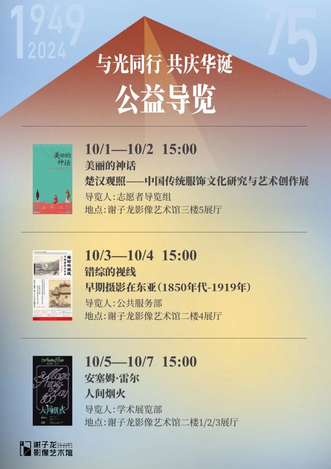 国庆小长假,谢子龙影像艺术馆为大家准备了一场艺术盛宴,五场展览、公益导览、特别活动、打卡拍照……陪你共同度过一个欢乐有趣的国庆假期!