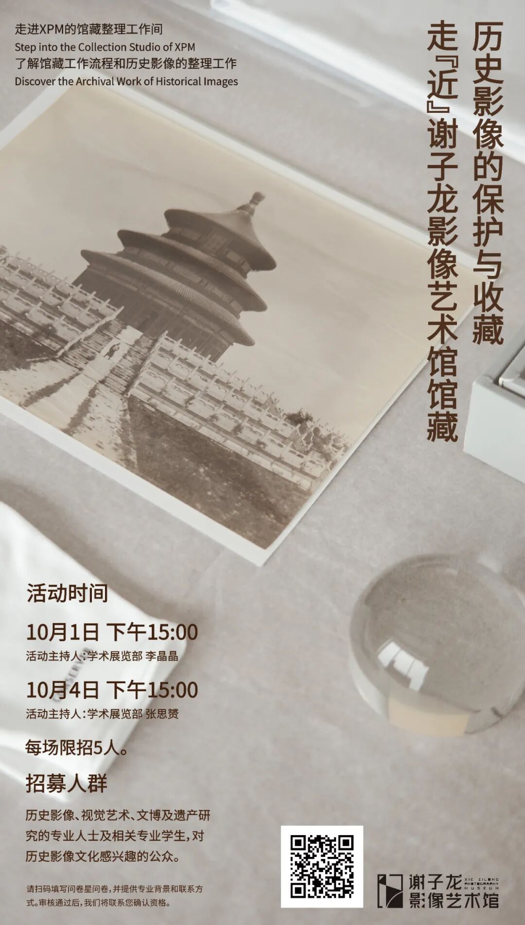 这个“十一”假期,和家人朋友来到谢子龙影像艺术馆,参与一次特别的馆藏工作坊!进入馆藏整理工作间,了解历史影像的保护与整理流程,近距离接触珍贵的蛋白照片、银盐照片、玻璃底片等不同材质的老照片。你将有机会探索这些珍贵影像背后的故事,感受历史的厚重与美感。