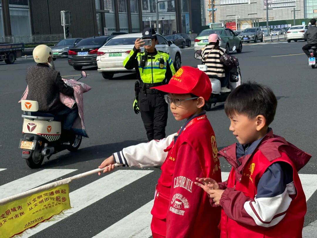 学习了交通手势,光有“理论”怎么行?我们还得“上岗执勤”呢!最后,小记者们跟随交警叔叔在路口进行实操演练。