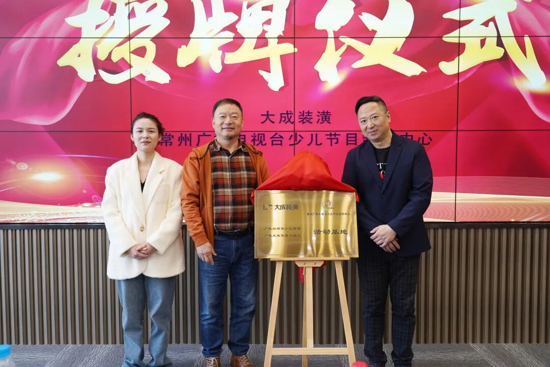 揭牌仪式现场,大成装潢董事长吴震昶、常州广播电视台少儿节目制作中心副主任陈娜、常州广播电视台主持人毛辰共同为大成梦工厂活动基地揭牌,这标志着大成梦工厂“广电融媒体小记者”“龙城体育小达人”活动基地正式成立。