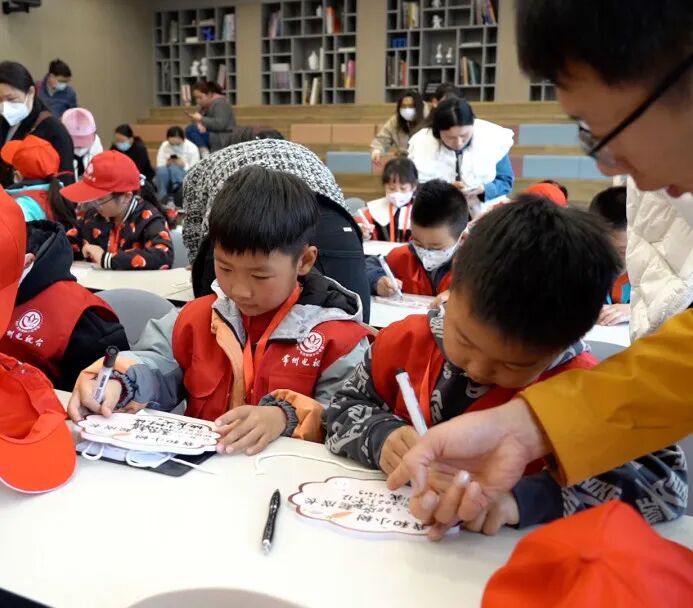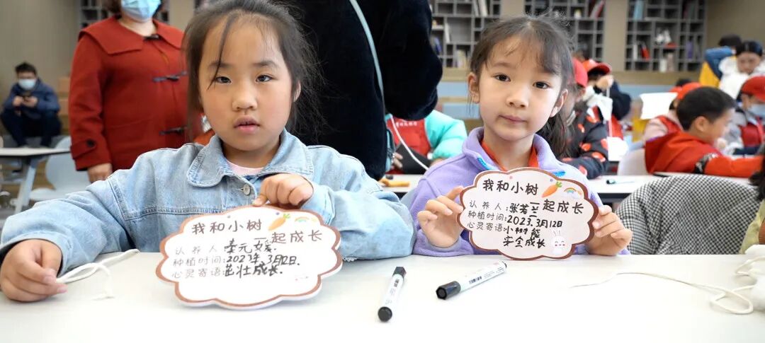 揭牌仪式结束后,小记者和小达人们认真地在认养标志牌写下自己的名字、寄语等,创造出自己心目中的树牌,随后在工作人员的引导下来到成园,在树上悬挂认养标志牌,铭志于树,寄情于绿。