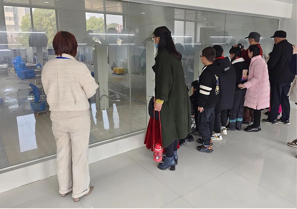 随后,总经理助理李琳带领大家来到生产观光通道。通过透明的观光通道,可以看到生产车间内忙碌的场景。李琳向大家详细介绍了10W级空气净化车间的规模以及生产流程。