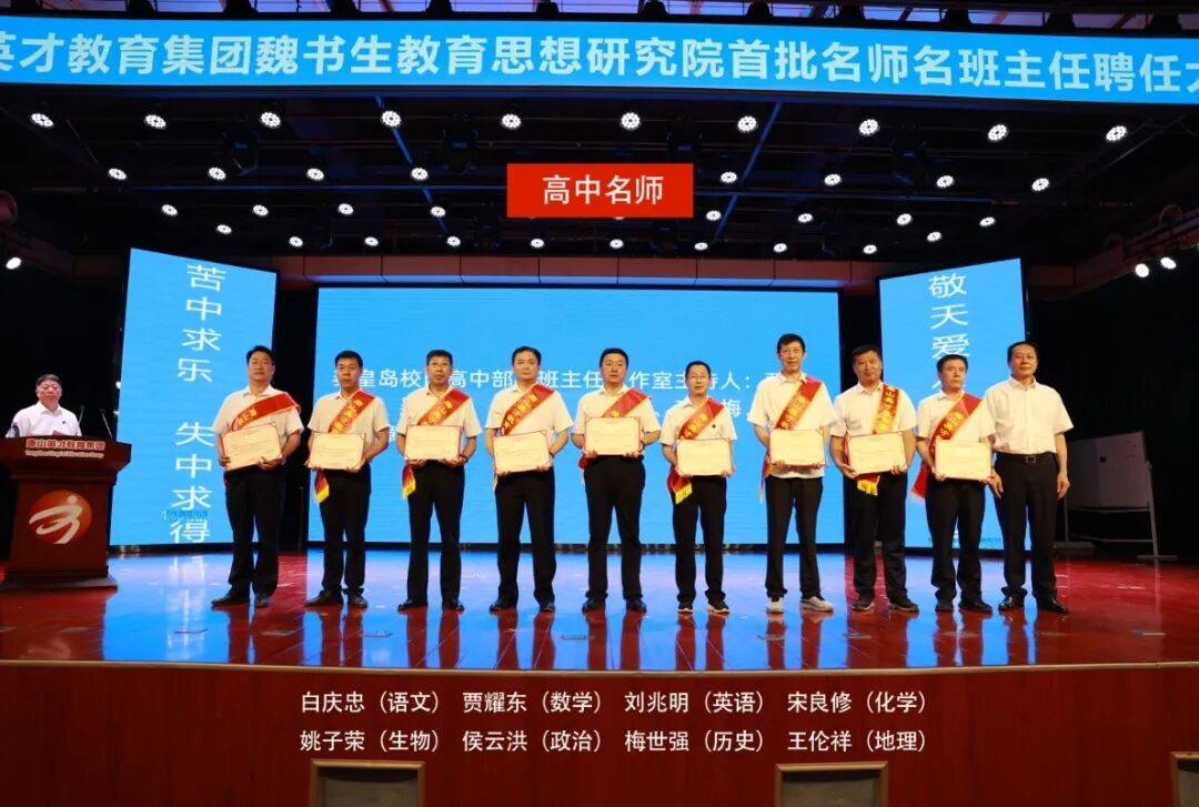 副总校长兼初中部校长杨梅、初中部常务副校长陈桂生、初中部副校长贾凤淑、一中英才分校常务副校长侯云洪、秦皇岛校区高中部校长王远贺分别为初中部语文、数学、英语、理综、文综学科名师工作室授牌,并为工作室成员颁发聘书。