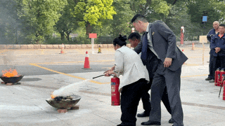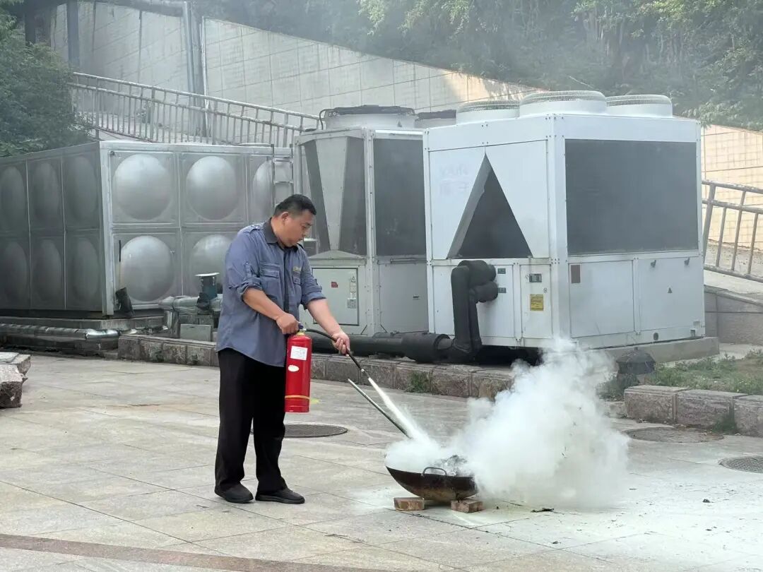 情景演习结束后,酒店组织演习人员进行干粉灭火器使用的实操练习,整个过程紧张有序、实用性强。