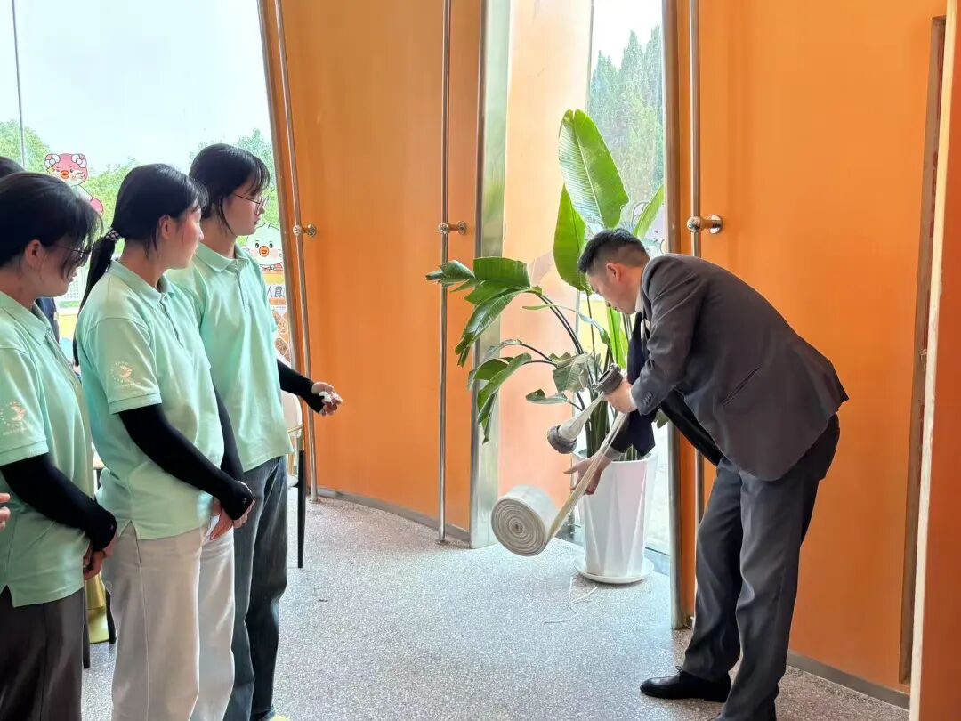 赵明双经理讲到室内消火栓是扑救初期火灾的重要消防设施,正确使用可有效控制火势。室内乐园小朋友较多,需格外注意使用前确认现场已断电,防止触电风险。非火灾情况下严禁随意开启消火栓,以免造成水损或设备故障。