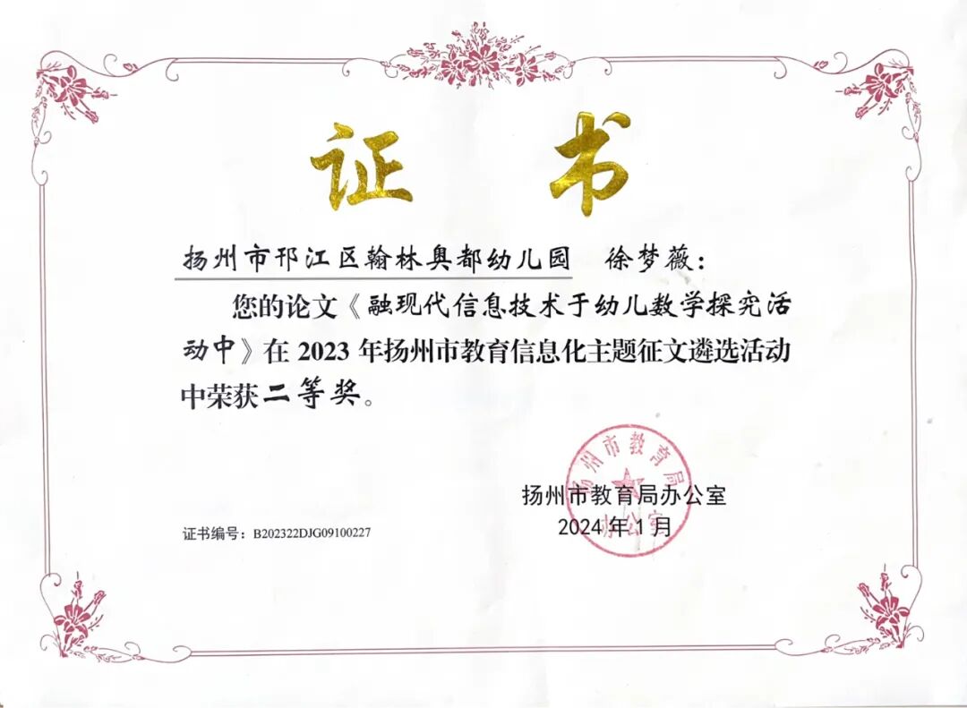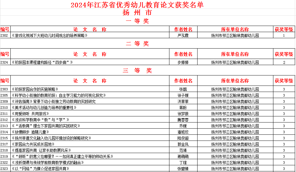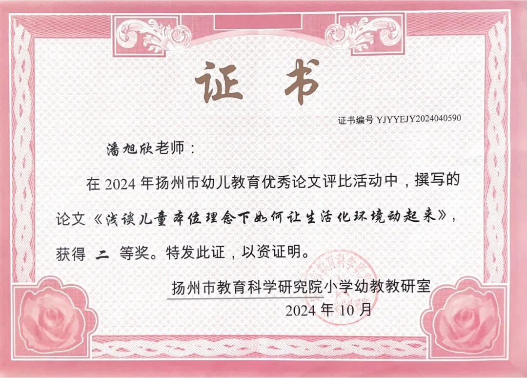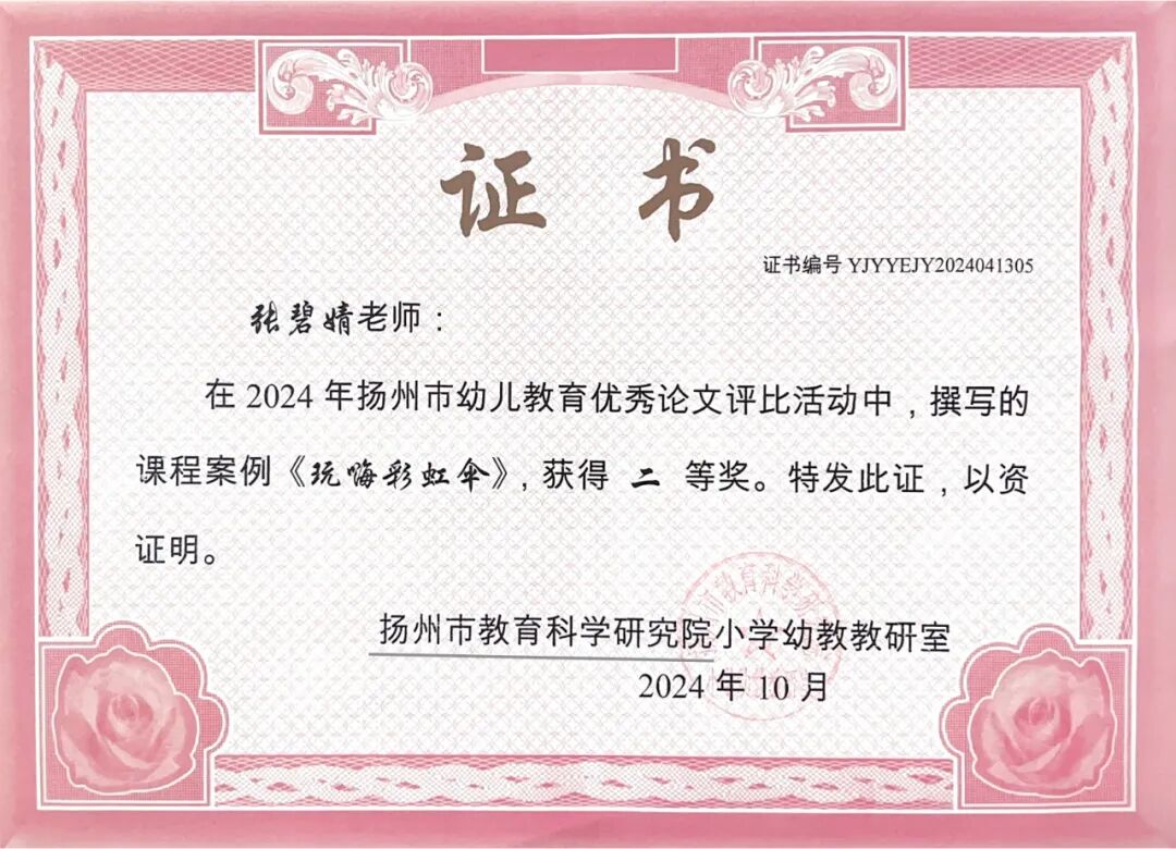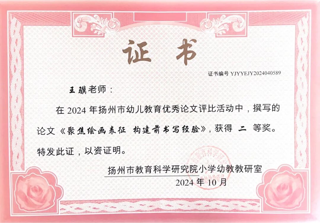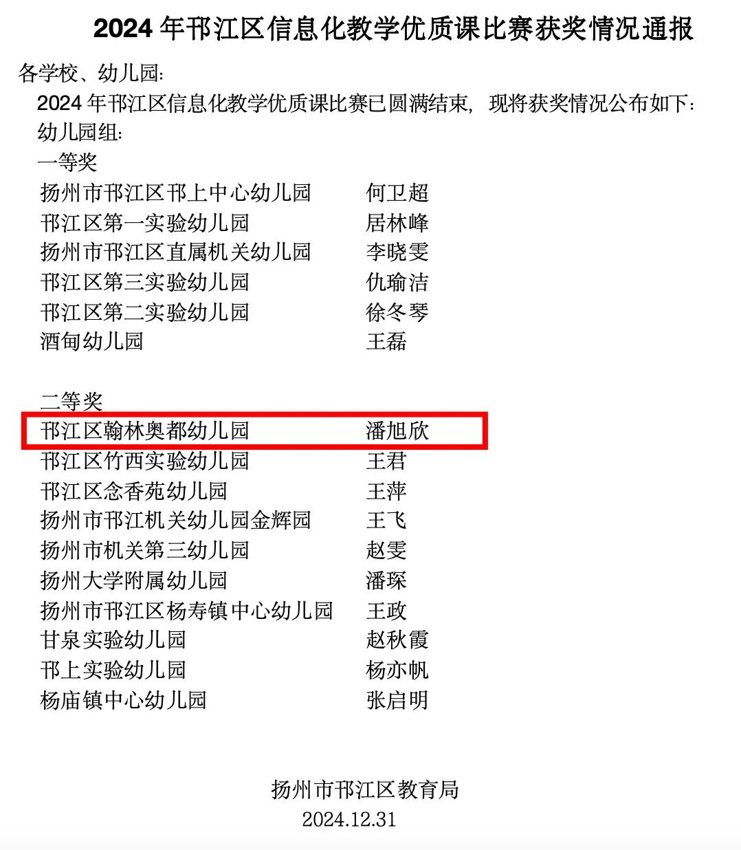 “教”有所获、“研”有所得。奥都园在市、区级名师团队的引领下,深耕教育实践,建构专业成长。2024年,奥都园步婷婷教师撰写的1篇论文在省级核心期刊发表;步婷婷、徐子媛等多名教师的论文获江苏省教育学会一、二、三等奖;王骥、潘慧、洪菲菲等多名教师获市教育论文二等奖;潘旭欣、徐梦薇、乔媛老师获市信息化论文中一等奖;郭金凤、李敏敏老师获区优质教学活动一、二等奖;潘旭欣老师获区信息化优质课二等奖;魏蓉蓉老师获区心理健康教育案例二等奖;乔媛老师微课获区家庭教育“百问百答”课程展评。