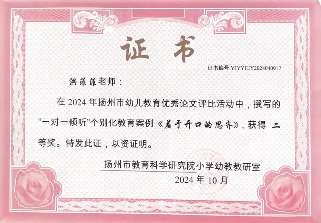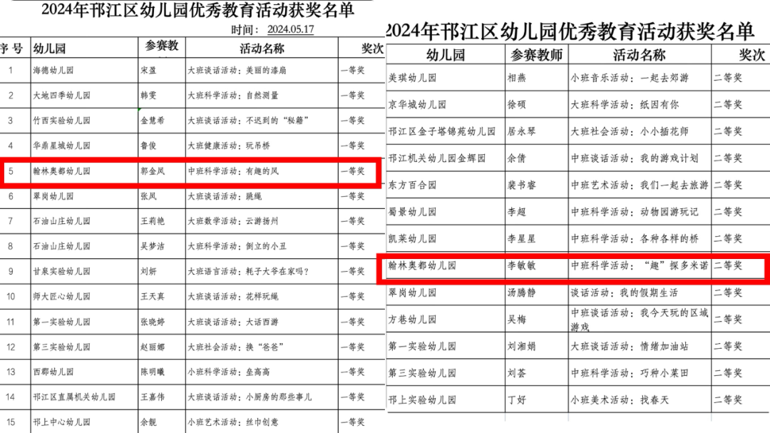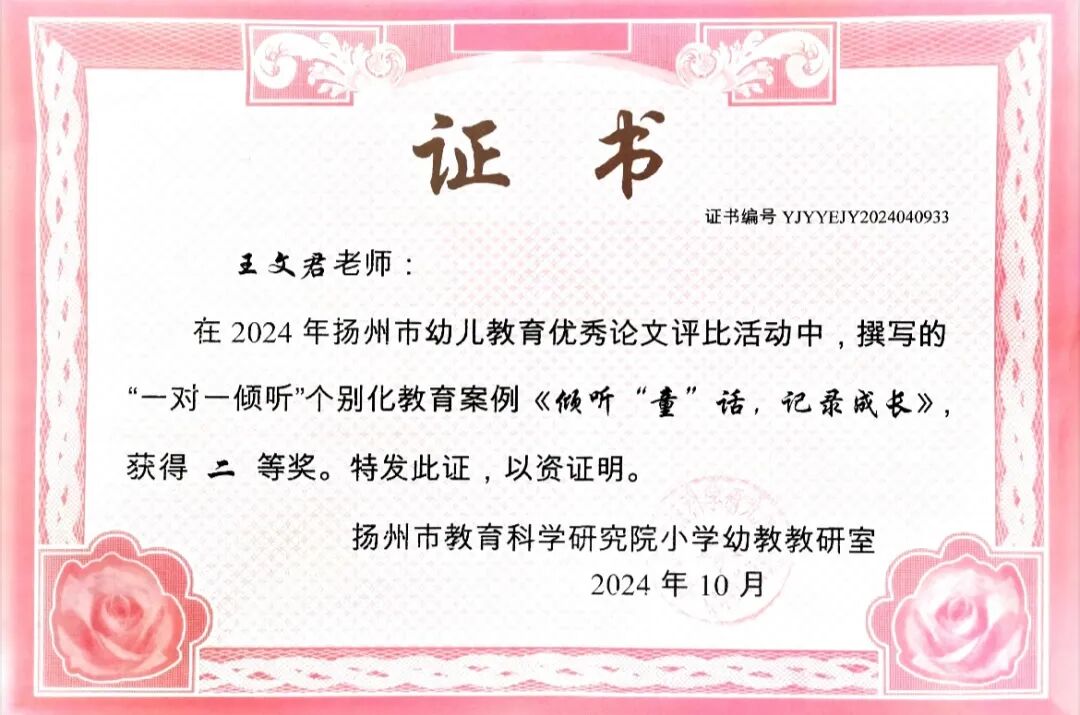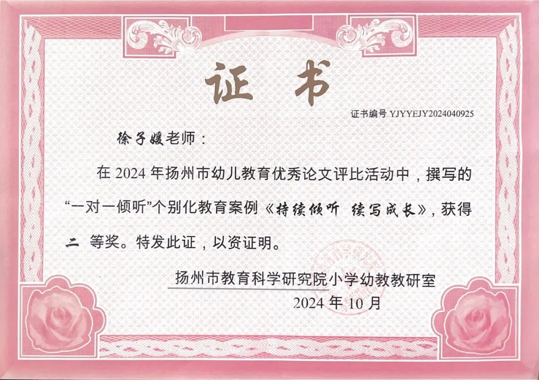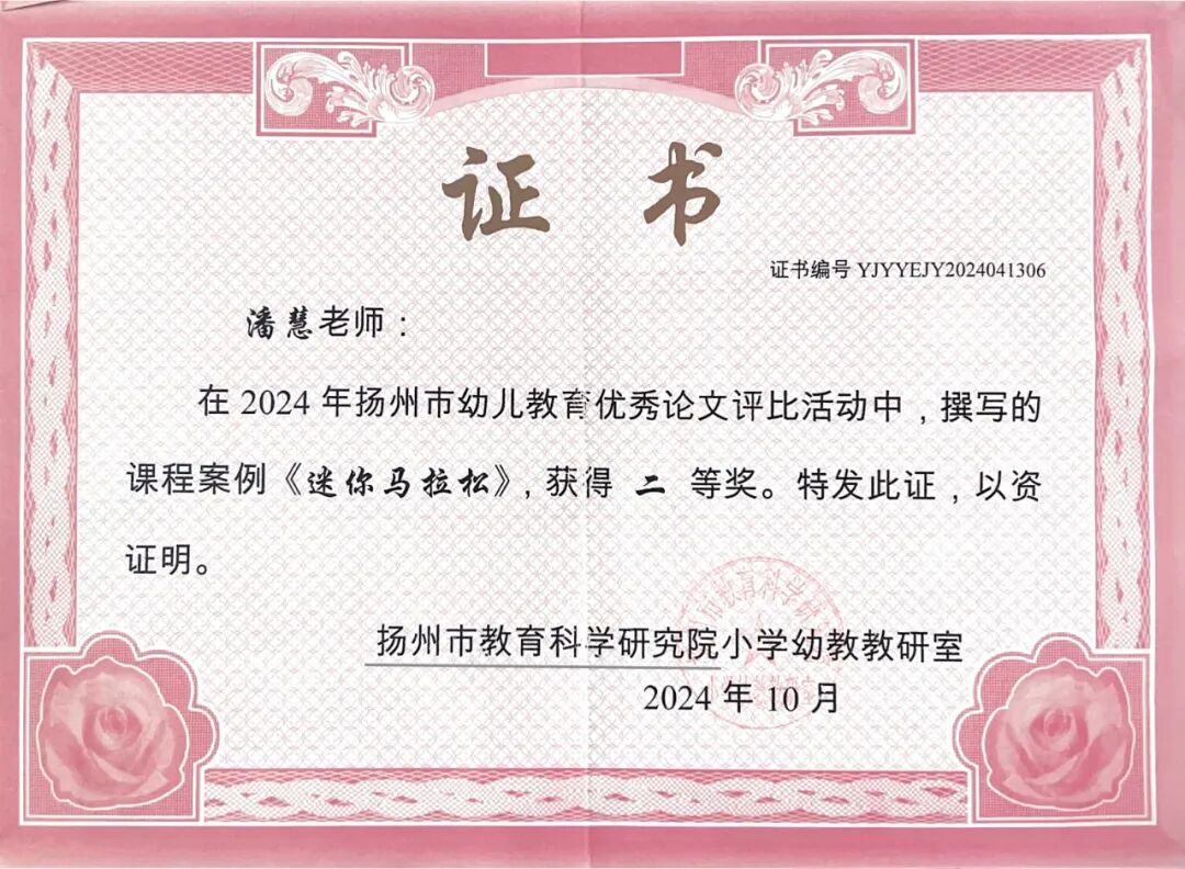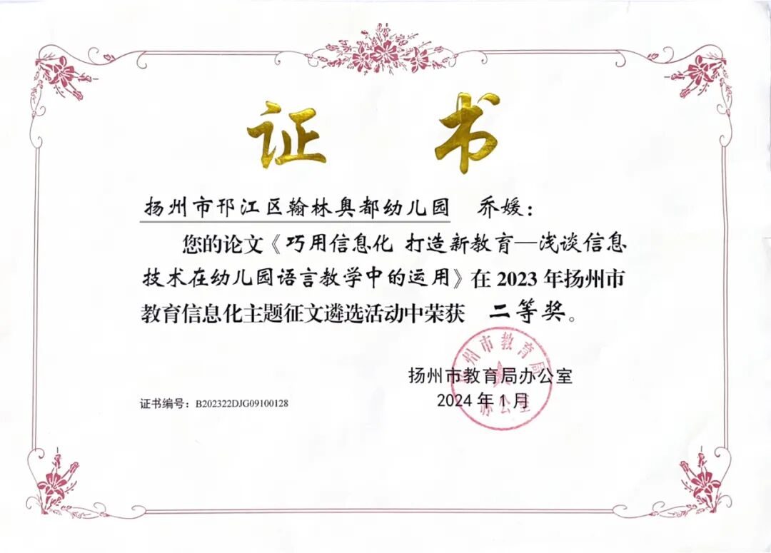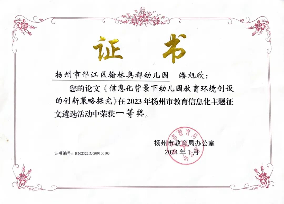 “教”有所获、“研”有所得。奥都园在市、区级名师团队的引领下,深耕教育实践,建构专业成长。2024年,奥都园步婷婷教师撰写的1篇论文在省级核心期刊发表;步婷婷、徐子媛等多名教师的论文获江苏省教育学会一、二、三等奖;王骥、潘慧、洪菲菲等多名教师获市教育论文二等奖;潘旭欣、徐梦薇、乔媛老师获市信息化论文中一等奖;郭金凤、李敏敏老师获区优质教学活动一、二等奖;潘旭欣老师获区信息化优质课二等奖;魏蓉蓉老师获区心理健康教育案例二等奖;乔媛老师微课获区家庭教育“百问百答”课程展评。