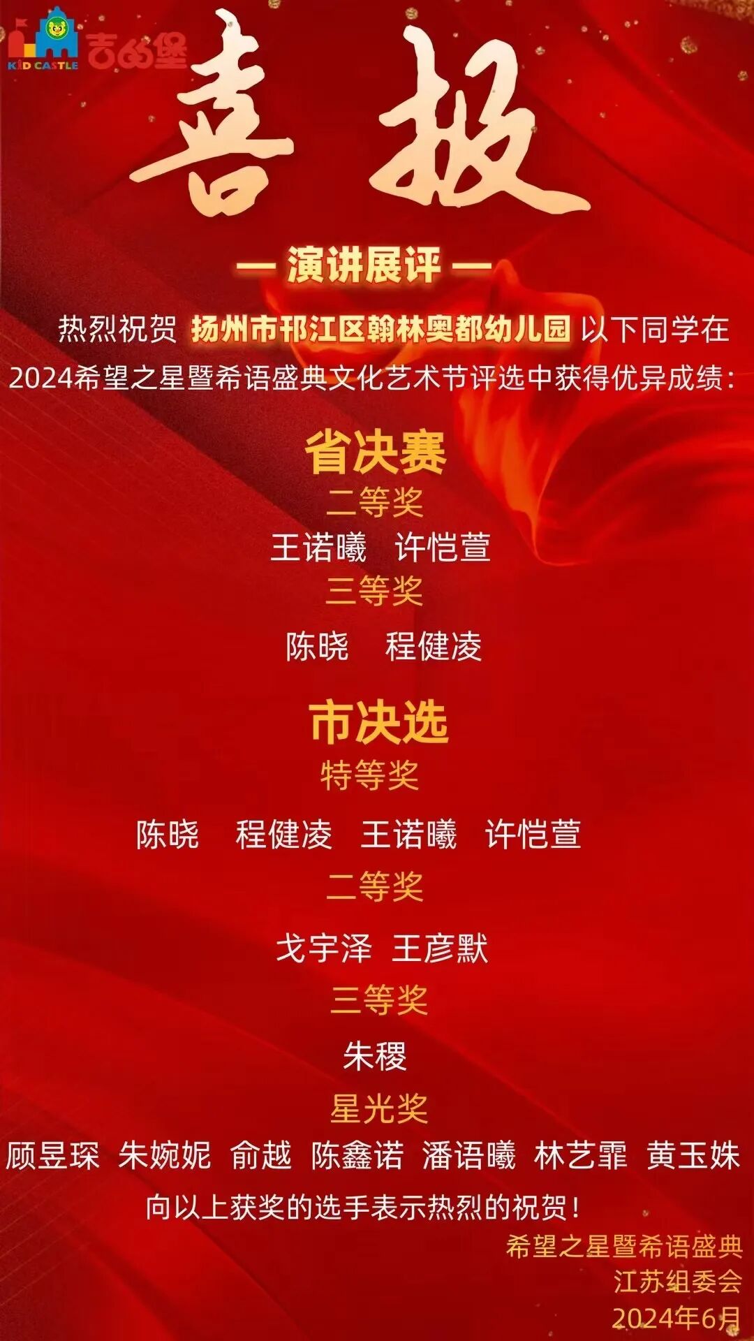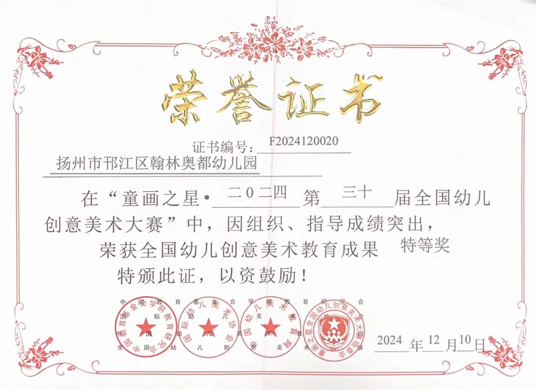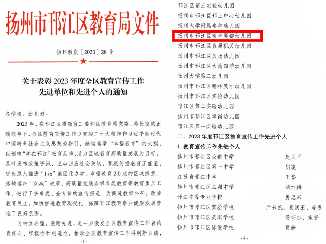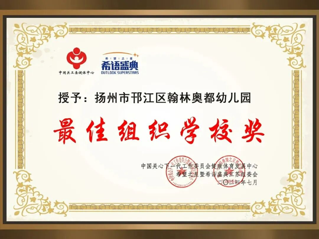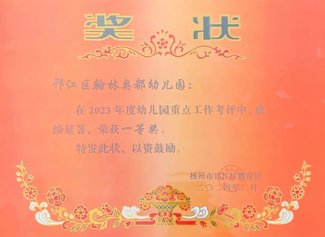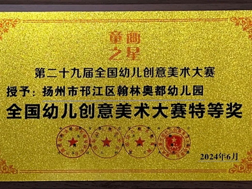 奥都幼儿园荣获区重点工作考评一等奖、区教育宣传考评先进单位。幼儿园接待区人民政府教育督导室的现场评估,得到了督导组的高度赞扬。幼儿园在“童画之星”全国幼儿创意美术大赛中获教育成果特等奖、在“童年童画”全国艺术大赛中获教育成果特等奖。幼儿园连续十四年蝉联中央电视台CCTV希望之星英文大赛“最佳组织学校奖”。幼儿园各类活动分别在中国江苏网、江苏教育新闻网、扬州教育在线等新闻媒体中报道,得到了教育部门和社会各界的好评与赞誉。