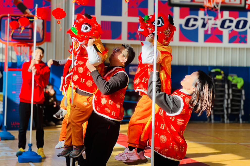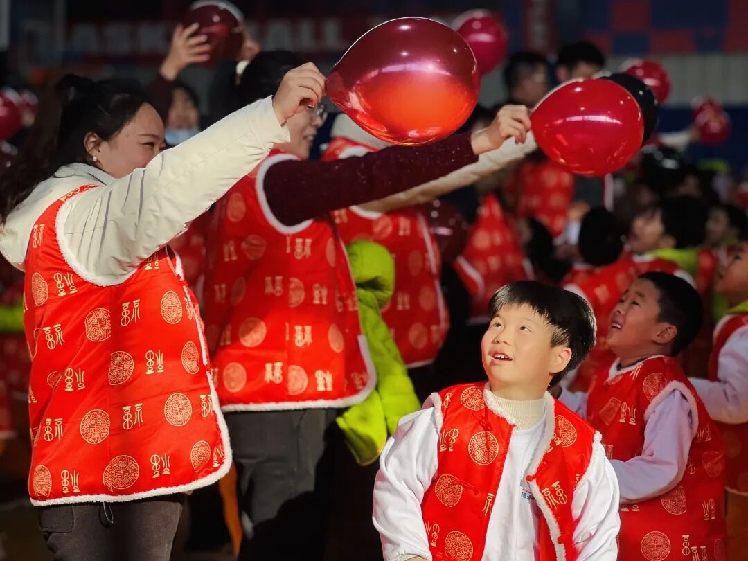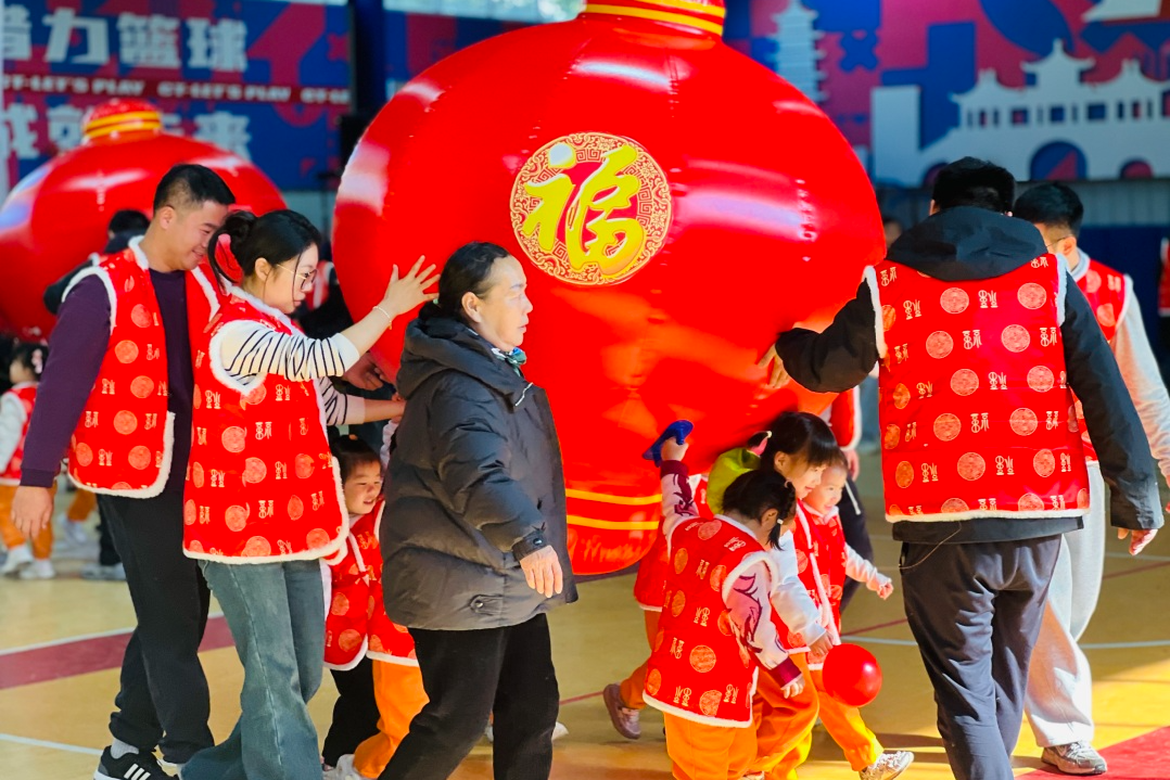 徒手互动游戏“大红灯笼高高挂”中,主持人与大小朋友一问一答,趣味十足。摘福气、贴福字和做福龙道具互动福字气球的活动,拉近了亲子间的距离。