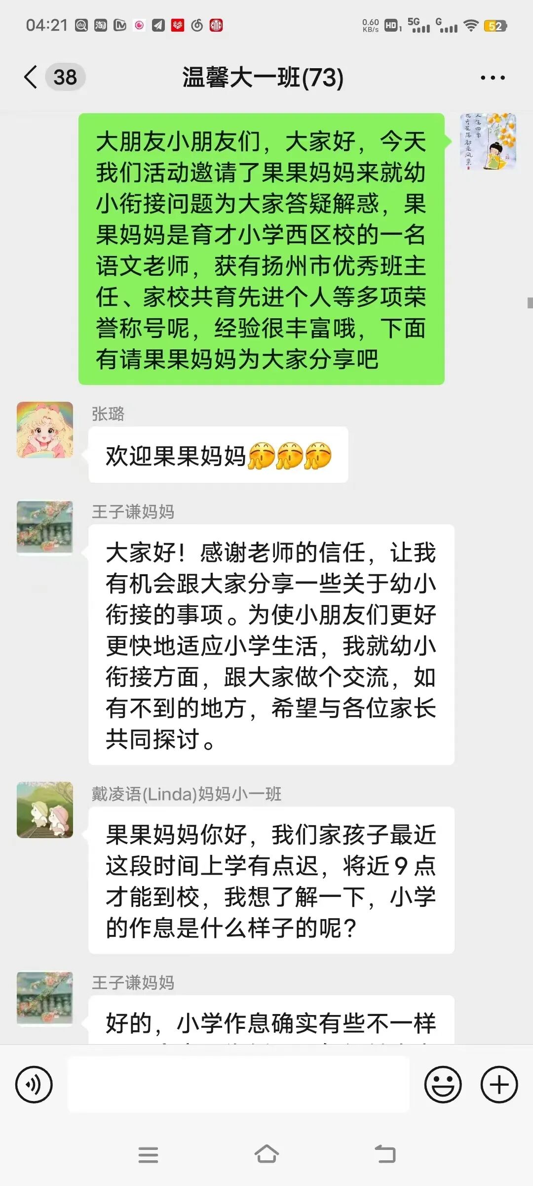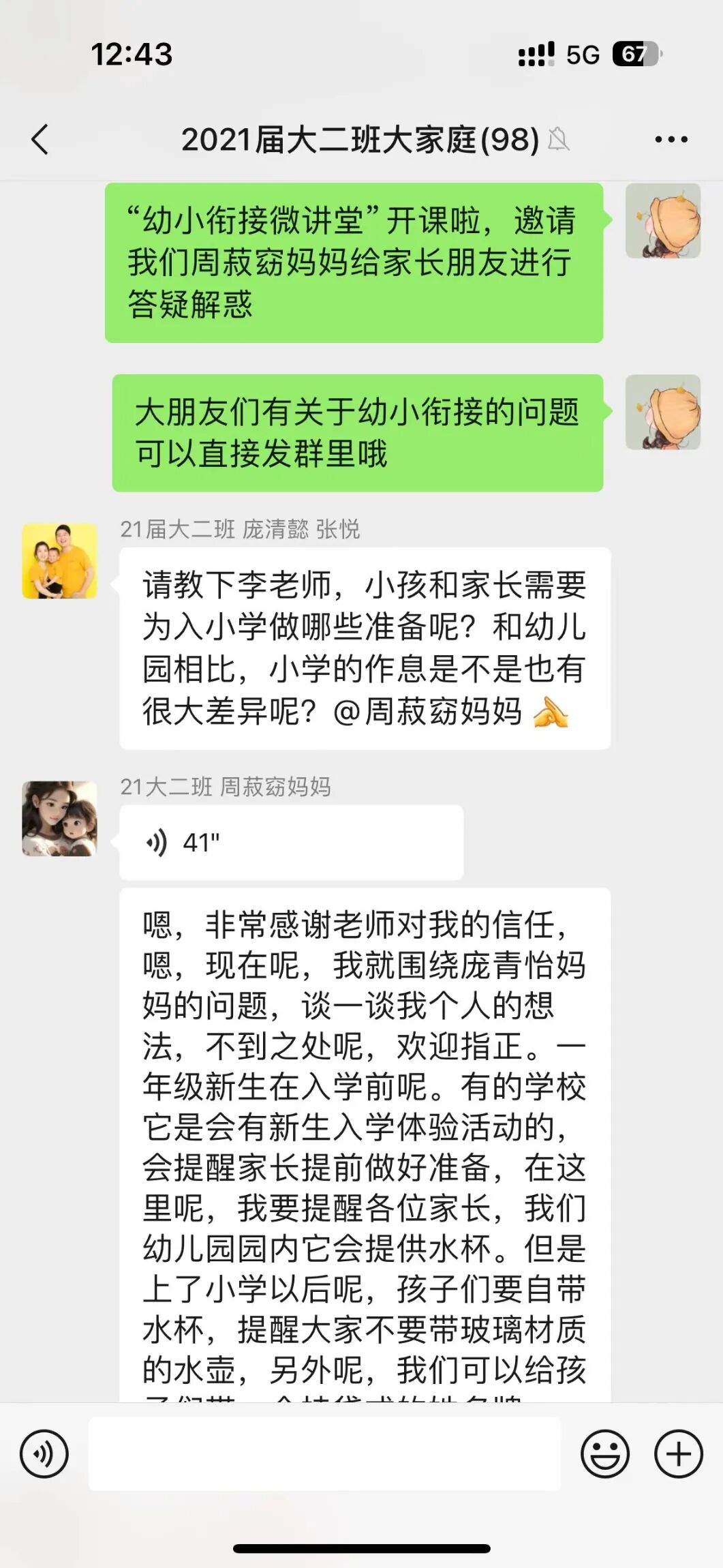 “生活即教育,行为即课程”为了更好增进亲子关系,让家园形成教育合力。幼儿园还邀请专家线上线下来支招,和家长一同讨论、分享大班幼小衔接的一些准备与方法,帮助家长与孩子用科学的、有效的方法做好升入小学的各项准备,更好的实现从幼儿园到小学的平稳过渡。