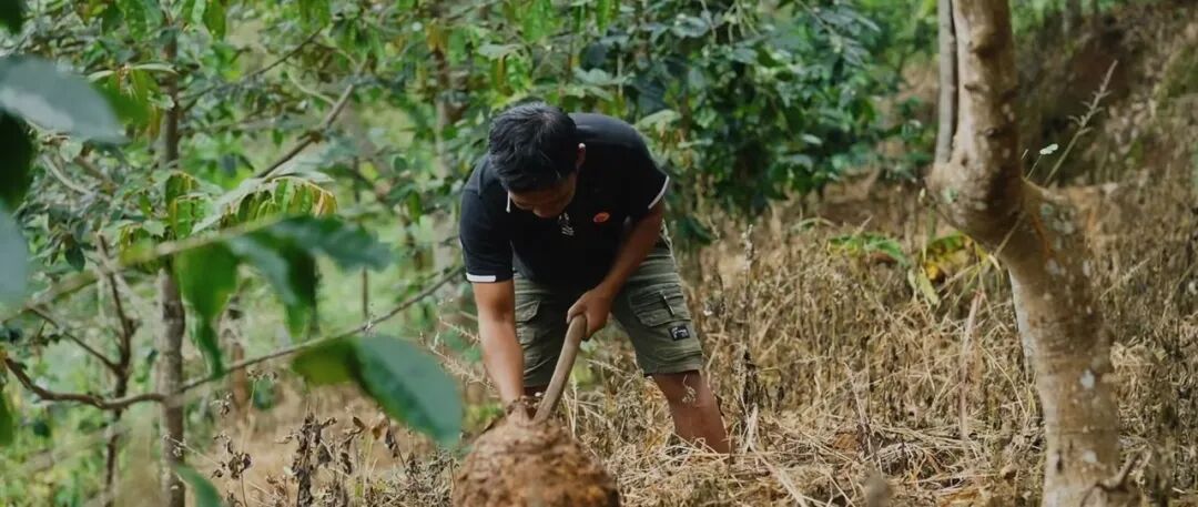 第一天上山,Yesko 带我们去看他的魔芋地。他告诉我们,“魔芋要种在山上,才长得好。”他一边挖土,一边像上课一样讲解:“这沟是排水的,要不然它会烂。”“翻土要这样,它才长得大。”