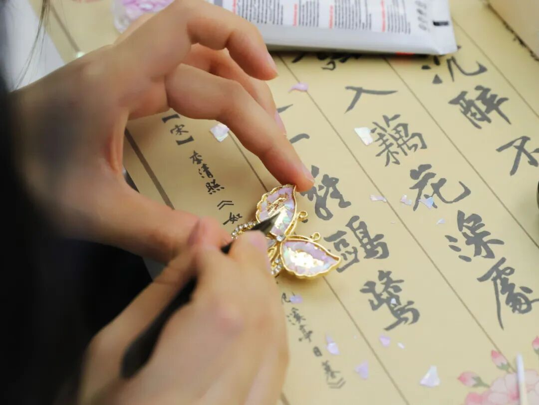 源自唐宋的“螺钿镶嵌”,用指尖触碰国家级非遗工艺,老师从材料的认识、粘贴技巧,到色彩搭配,为大家进行浅显易懂的示范和讲解,帮助没有手工基础的女性员工们轻松动手制作胸针,在老师的指导下,一件件新颖别致的螺钿胸针逐渐成型,大家相互交流、纷纷与自己的作品拍照留影,现场气氛热烈活跃。