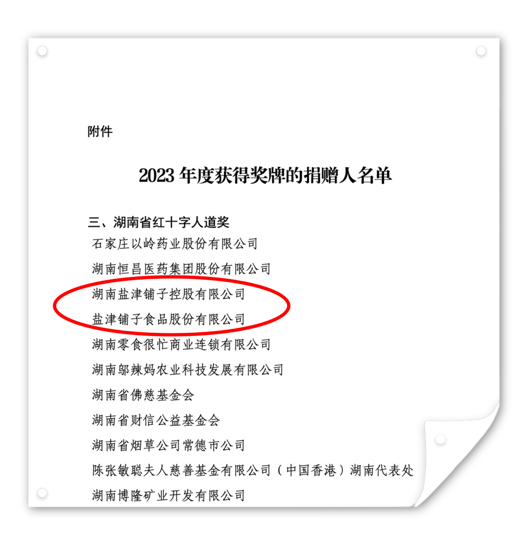 2月21日,湖南省红十字会发布《关于授予2023年度为湖南省红十字事业作出突出贡献的捐赠人奖牌的通报》,授予湖南盐津铺子控股有限公司、盐津铺子食品股份有限公司“湖南省红十字人道奖”,此外,省红十字会还授予11个捐赠人“湖南省红十字博爱奖”,授予25个捐赠人“湖南省红十字奉献奖”。