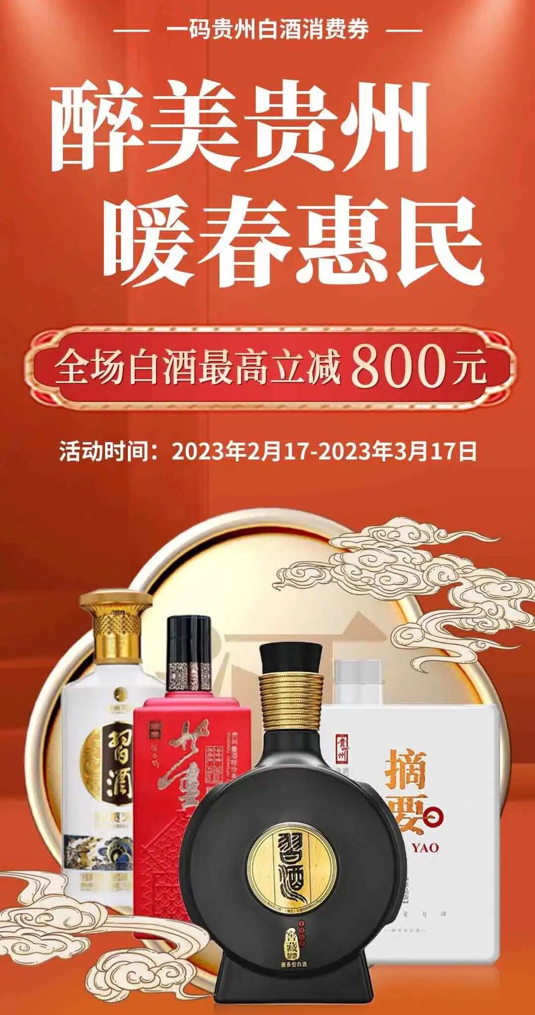 ● 本次白酒促销活动时间为2023年2月17日至3月17日,将通过“一码贵州”APP或小程序进入专题页领取白酒消费券。消费券可用于购买一码贵州商城白酒专题页产品并享受下单满减。