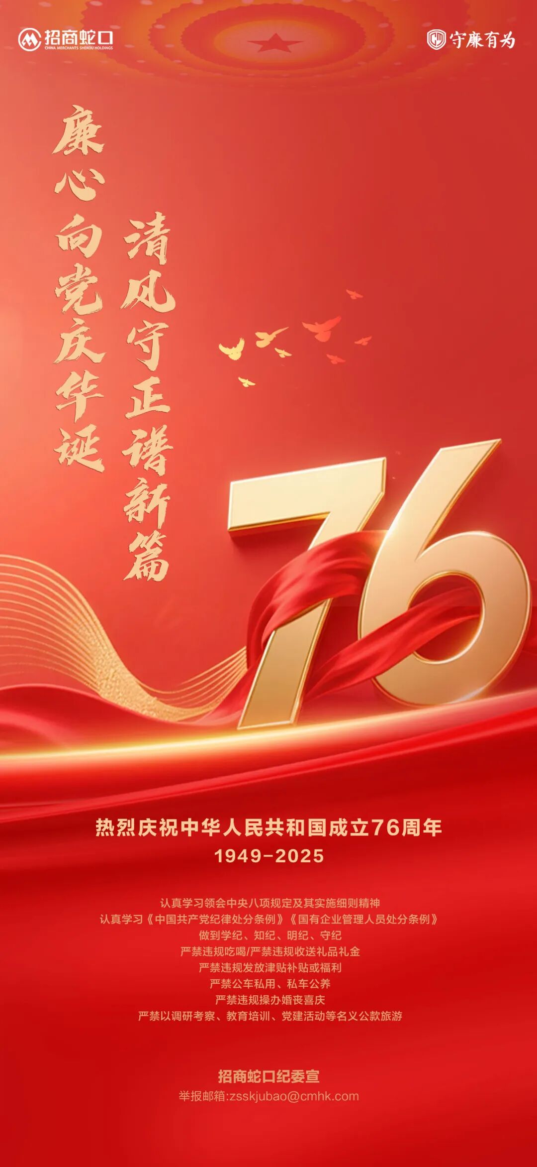 为巩固拓展深入贯彻中央八项规定精神学习教育成果,营造风清气正的节日氛围,招商蛇口郑州公司党支部提醒您,知敬畏、存戒惧、守底线,与家人共度一个欢乐祥和、廉洁文明的双节!