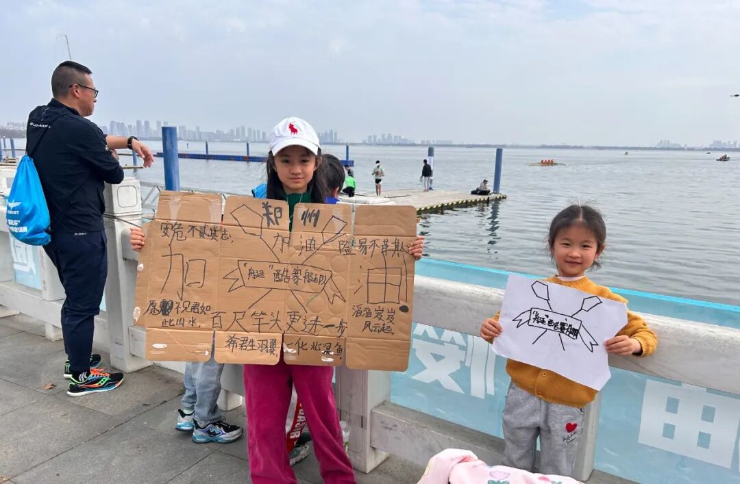 比赛当天,孩子扪用画笔在纸板上画出艇酷赛艇队的队旗和加油词,站在岸边为艇上的队员加油,这一幕令在场其他队伍纷纷侧目,停下脚步,用手机记录下这暖心的一刻。