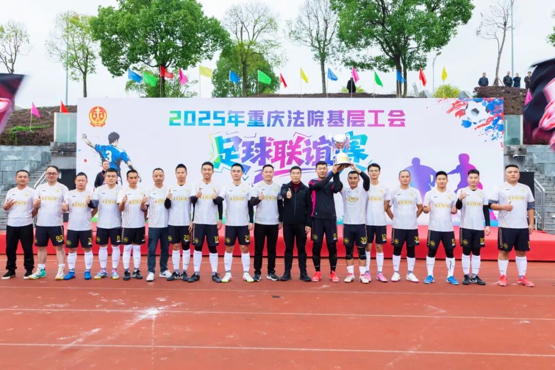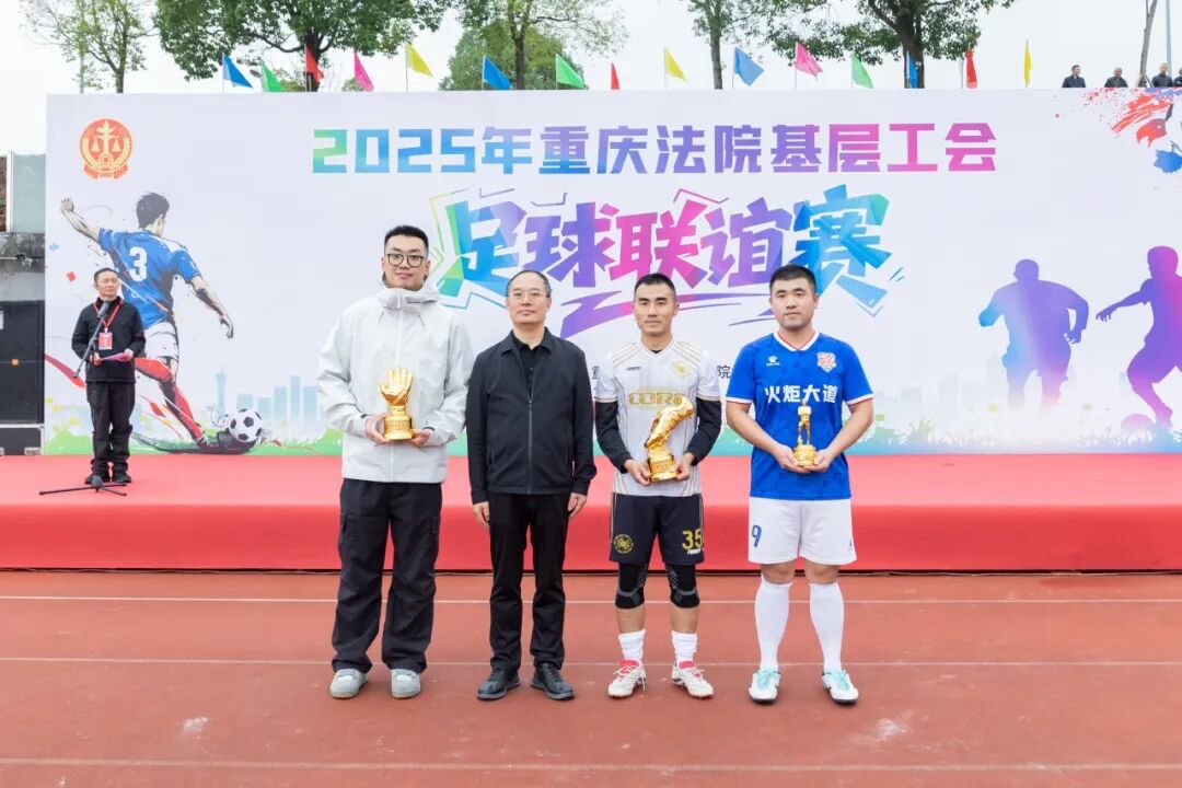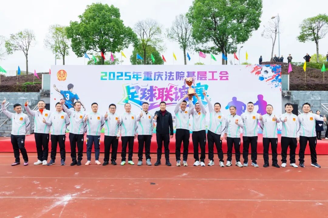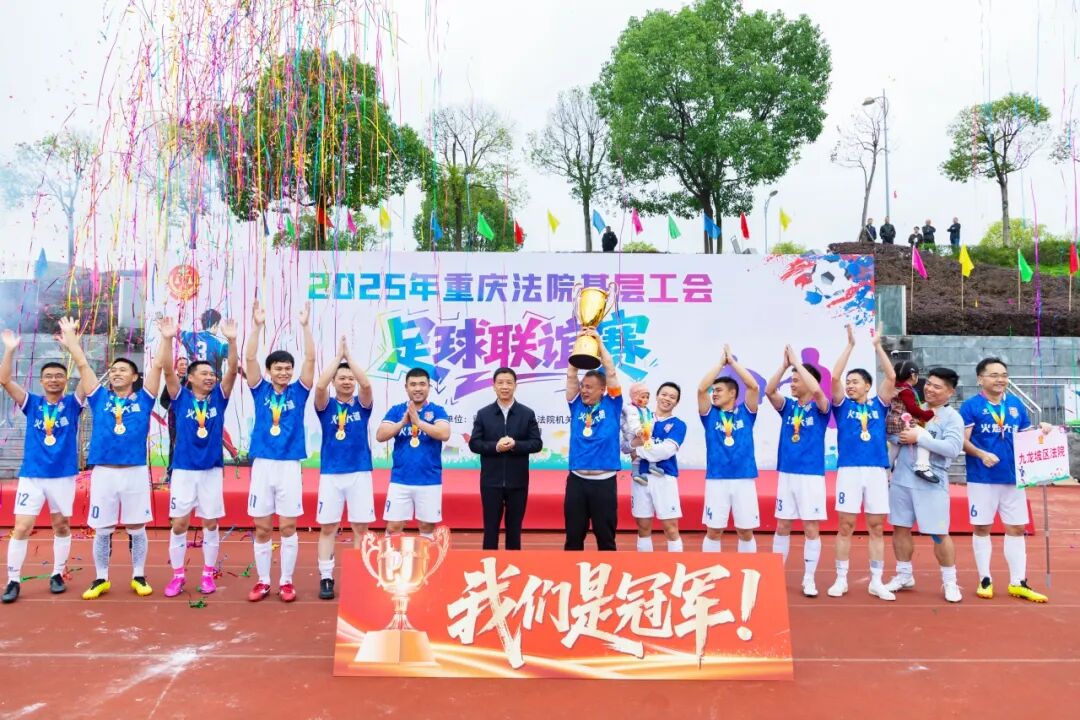 11月15日上午,2025年重庆法院基层工会足球联谊赛在江北机场体育中心足球场落下帷幕。九龙坡法院代表队夺得冠军,秀山法院、市高法院代表队分获亚季军。市高法院党组书记、院长李永利,党组成员、副院长谢宝红,党组成员、政治部主任莫绍勇出席闭幕式并为获奖球队、队员颁奖。市人大代表邓明鉴、苏家银、高艳平、杨刚受邀出席并观看比赛。近400名球迷现场呐喊助威。