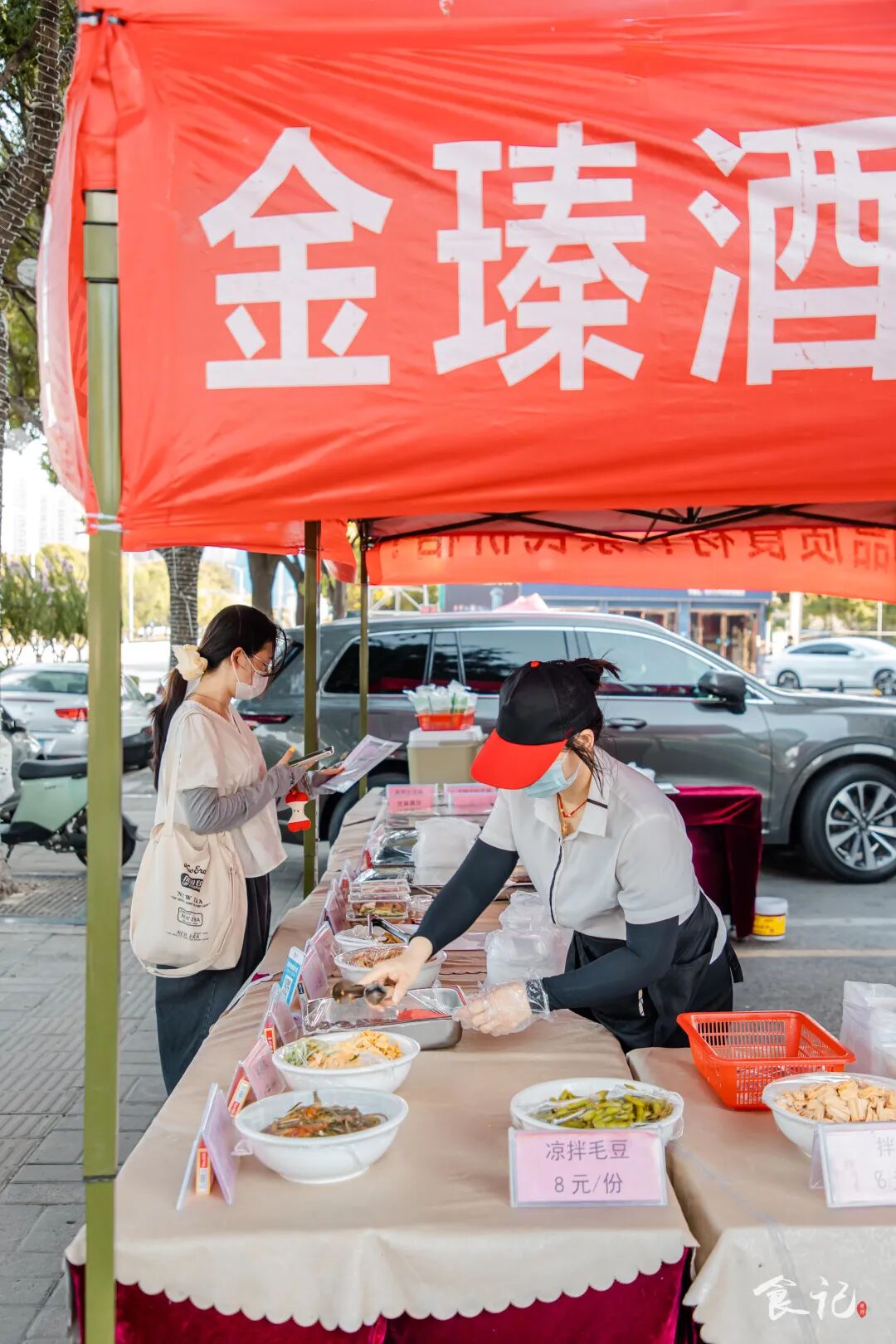每天两波摊位一开,不到一小时就被抢空。凉菜、卤菜、现炒热菜一字排开,荤素搭配,买上几份回家,一顿丰盛的下酒菜就齐了。