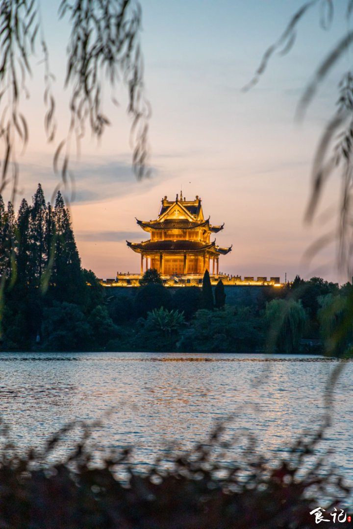 荟园是拍摄仲宣楼的最佳机位,楼上灯光亮起,赶上日落,绝美景色尽收眼底。